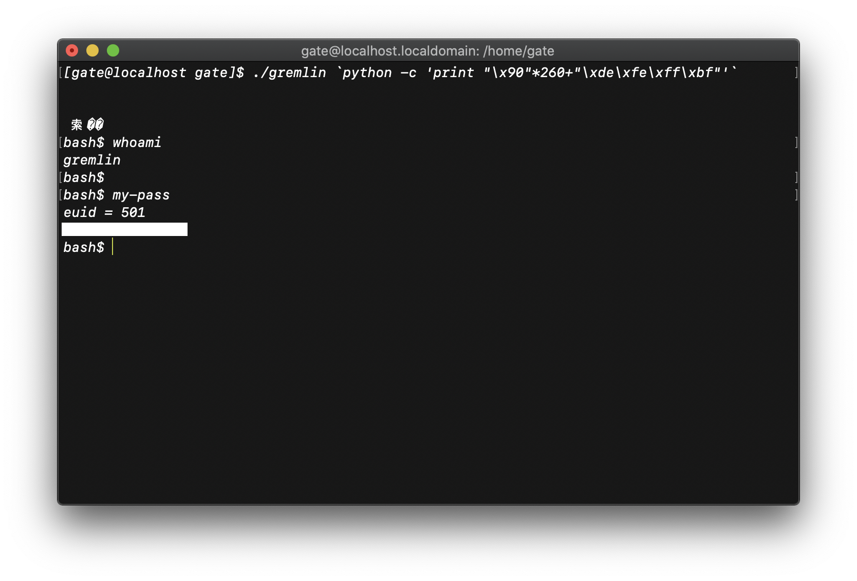 성공적으로 쉘을 땄다. 권한도 다음 레벨인 gremlin으로 넘어간 것을 볼 수 있다. my-pass를 입력하여 다음 레벨로 넘어가자.