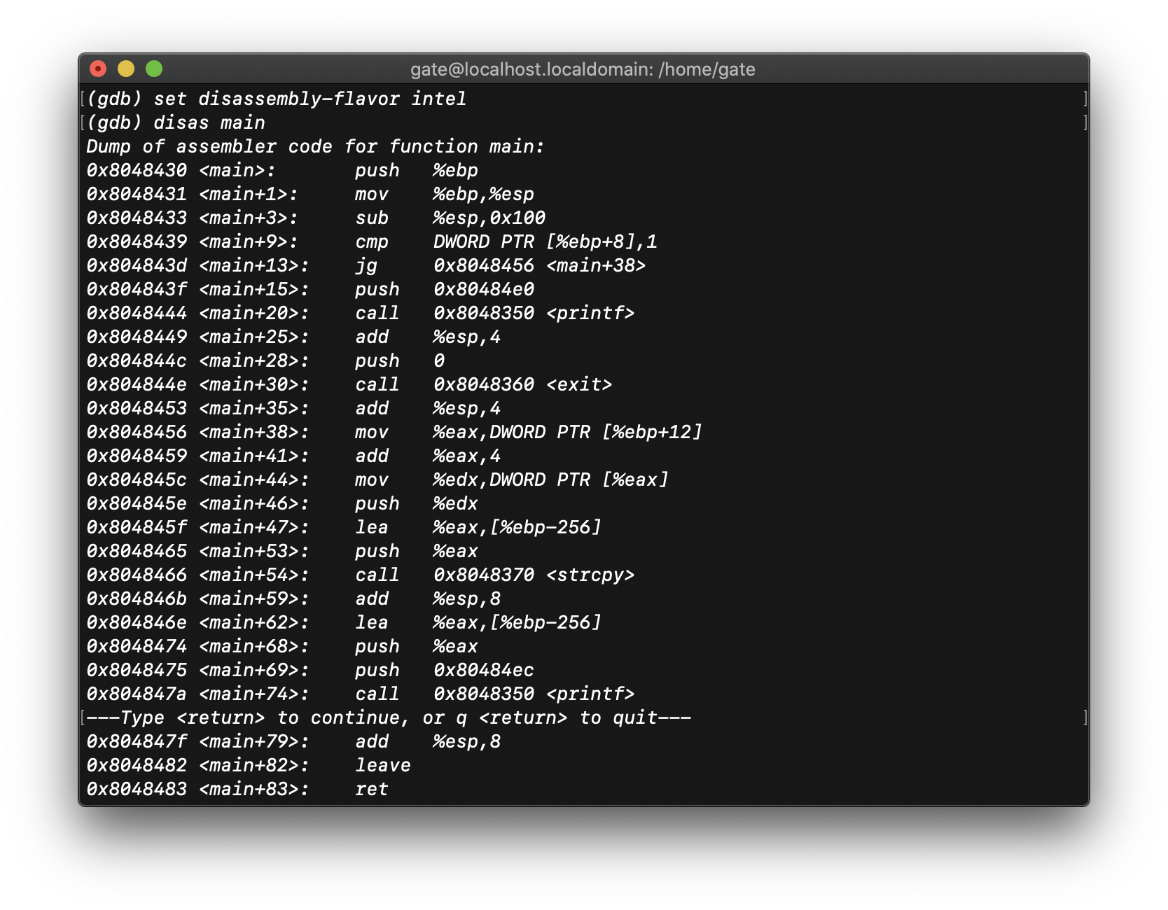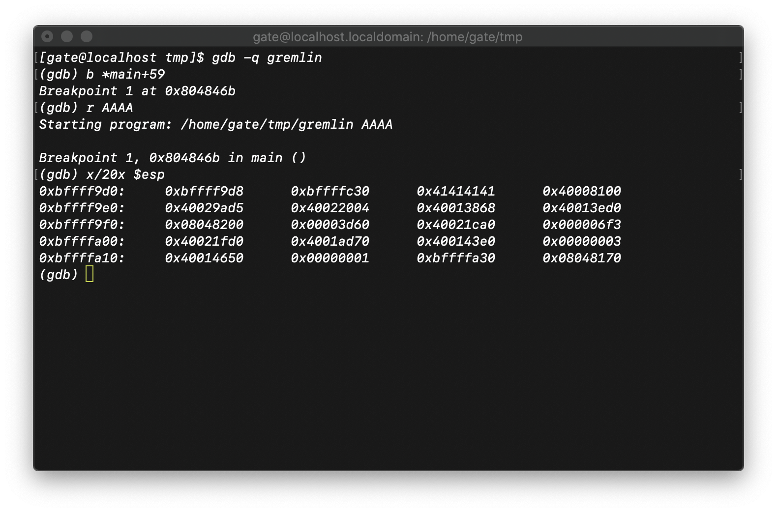 우선 gdb를 실행한 후에 strcpy를 호출하는 부분 바로 뒤인 main+59에 bp를 걸어주고 AAAA라는 인자를 주어 실행하자. 또 AAAA 라는 값이 어떤 주소에 저장되는지 확인하자.
