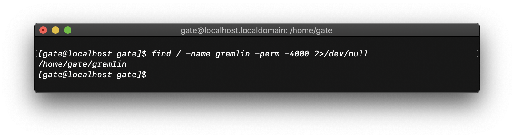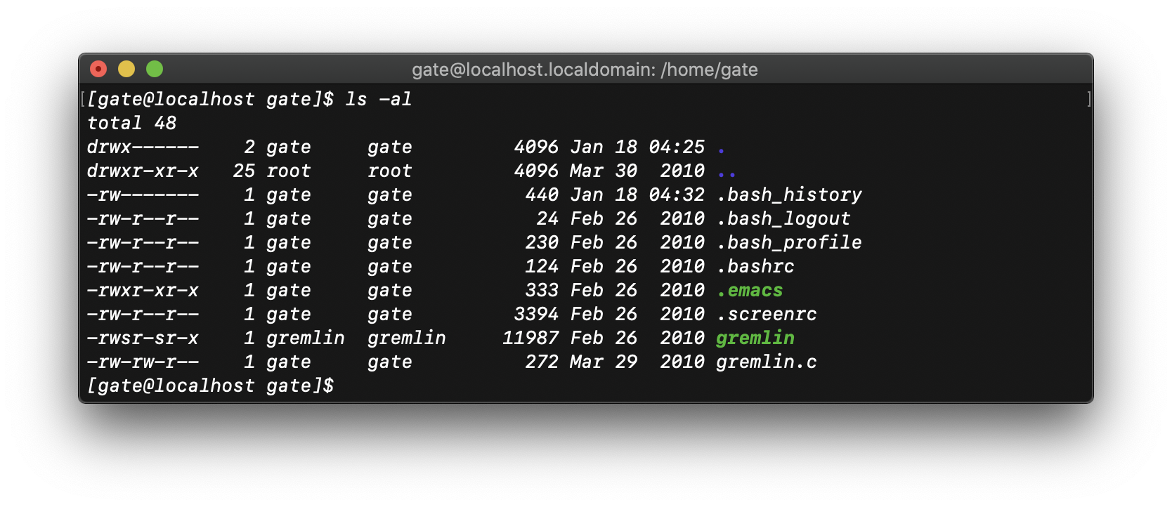 gremlin 프로그램에 SetUID가 설정되어 있다. 따라서 우리는 프로그램을 실행시키는 동안 root권한 혹은 다음 레벨의 권한을 얻을 것이다.