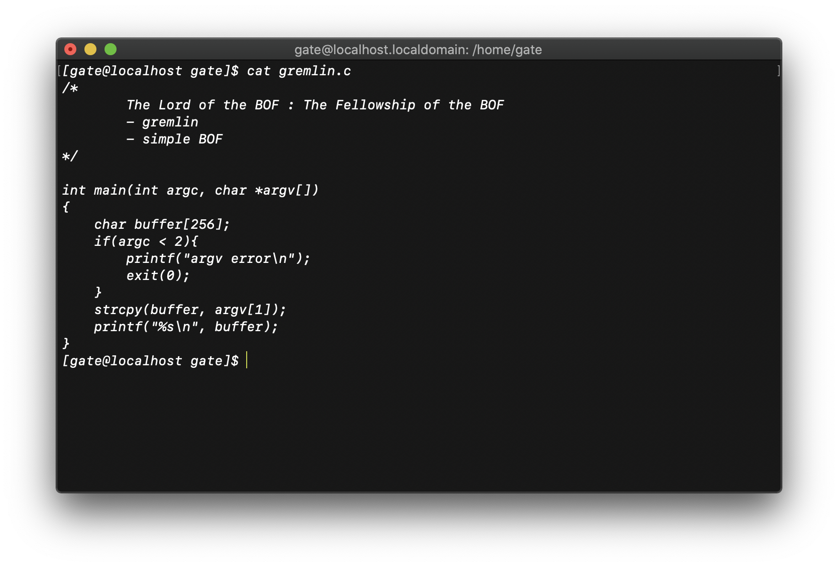 따라서 우리는 buffer(256) + sfp(4) 를 NOP로 덮고 ret 주소를 buffer의 시작주소로 바꾸면 될 것 같다. original gremlin은 gdb로 프로그램 run이 막혀있어서 tmp에 gremlin을 옮겨야 할 것 같다. tmp 디렉토리가 없으므로 새로 생성하고 gremlin 파일을 복사하여 gdb 분석을 더 진행해보자.