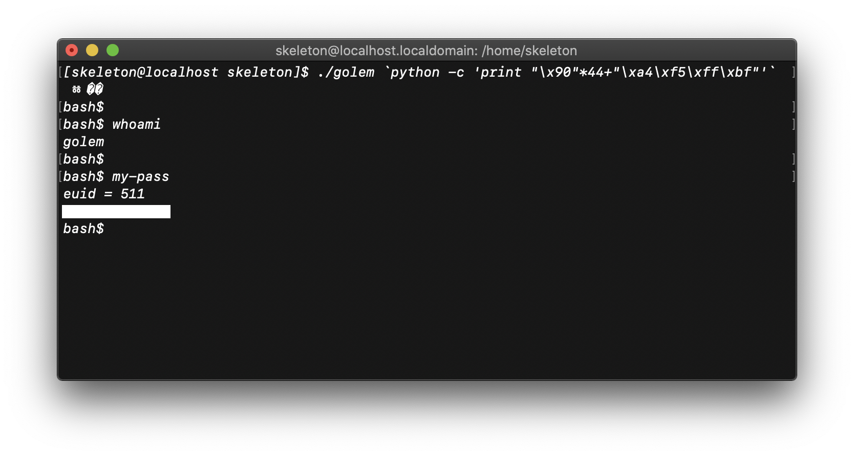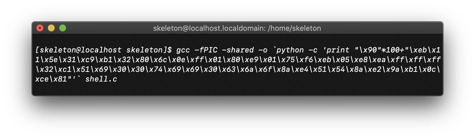 - 빈 파일을 코드로 취하고, NOP Sled + shellcode(without ‘/‘)를 이름으로 하여 아래와 같은 옵션을 부여하여 컴파일한다.
