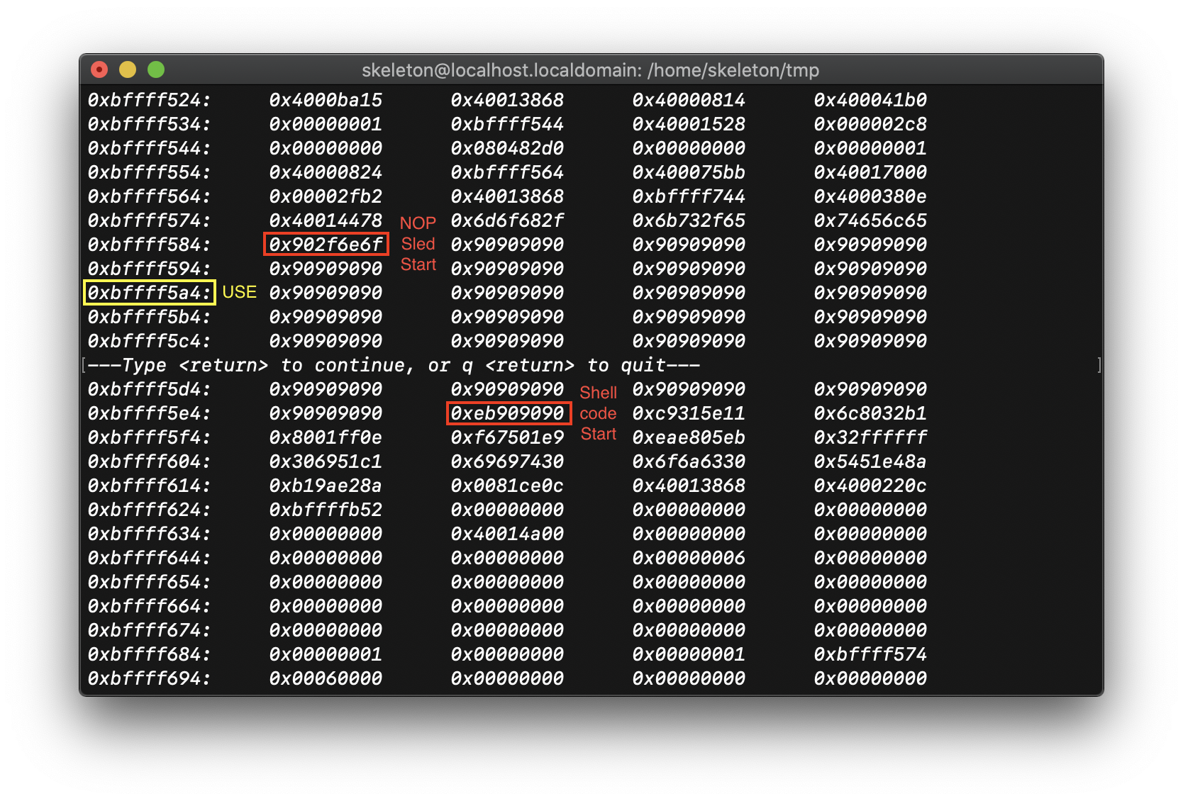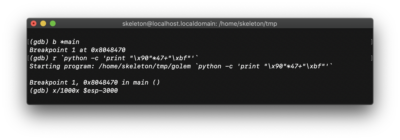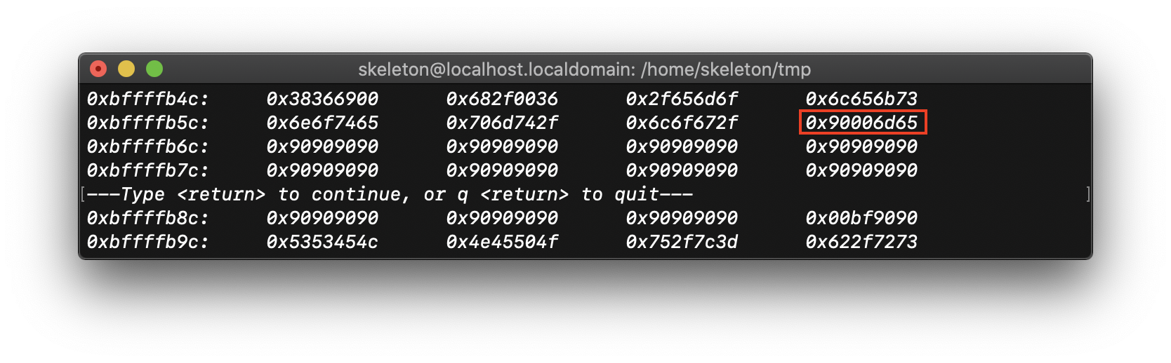 또한 아래 부분에 우리가 프로그램을 gdb 상에서 run 할 때에 넣어준 인자(NOP + \bf)도 있다.