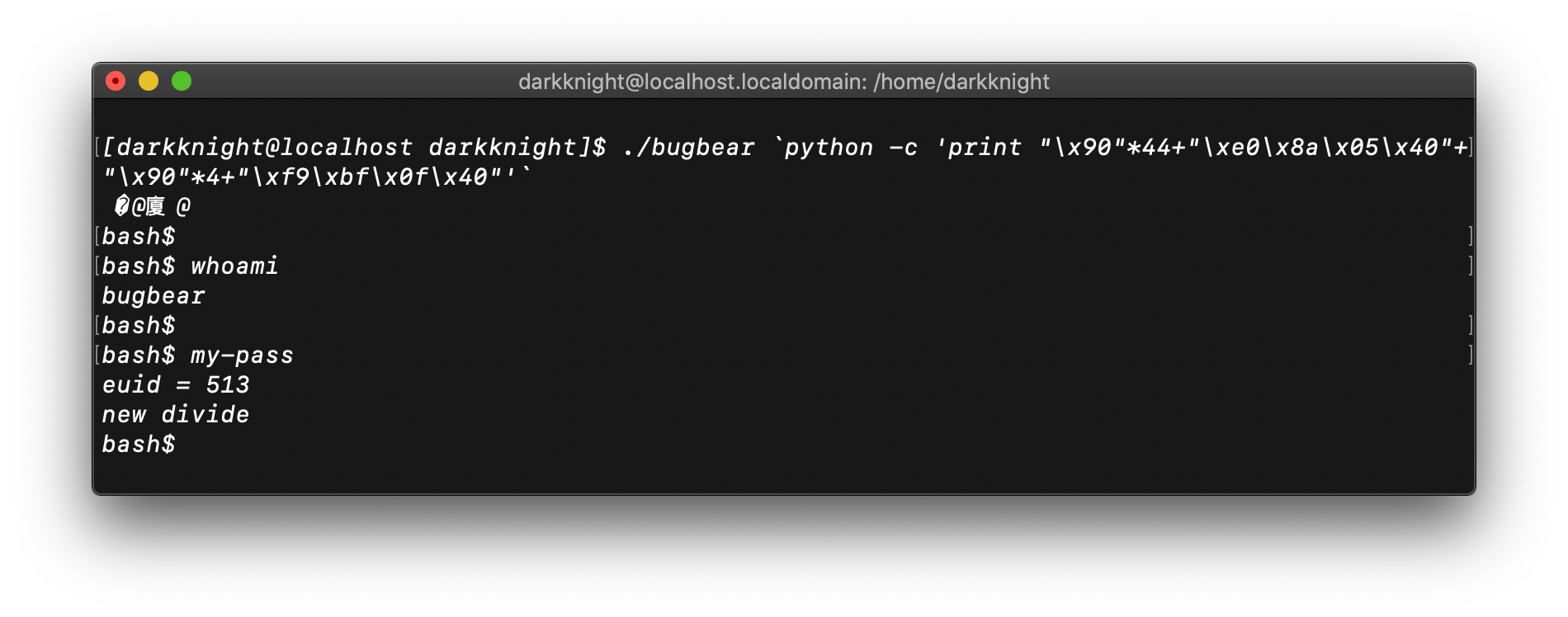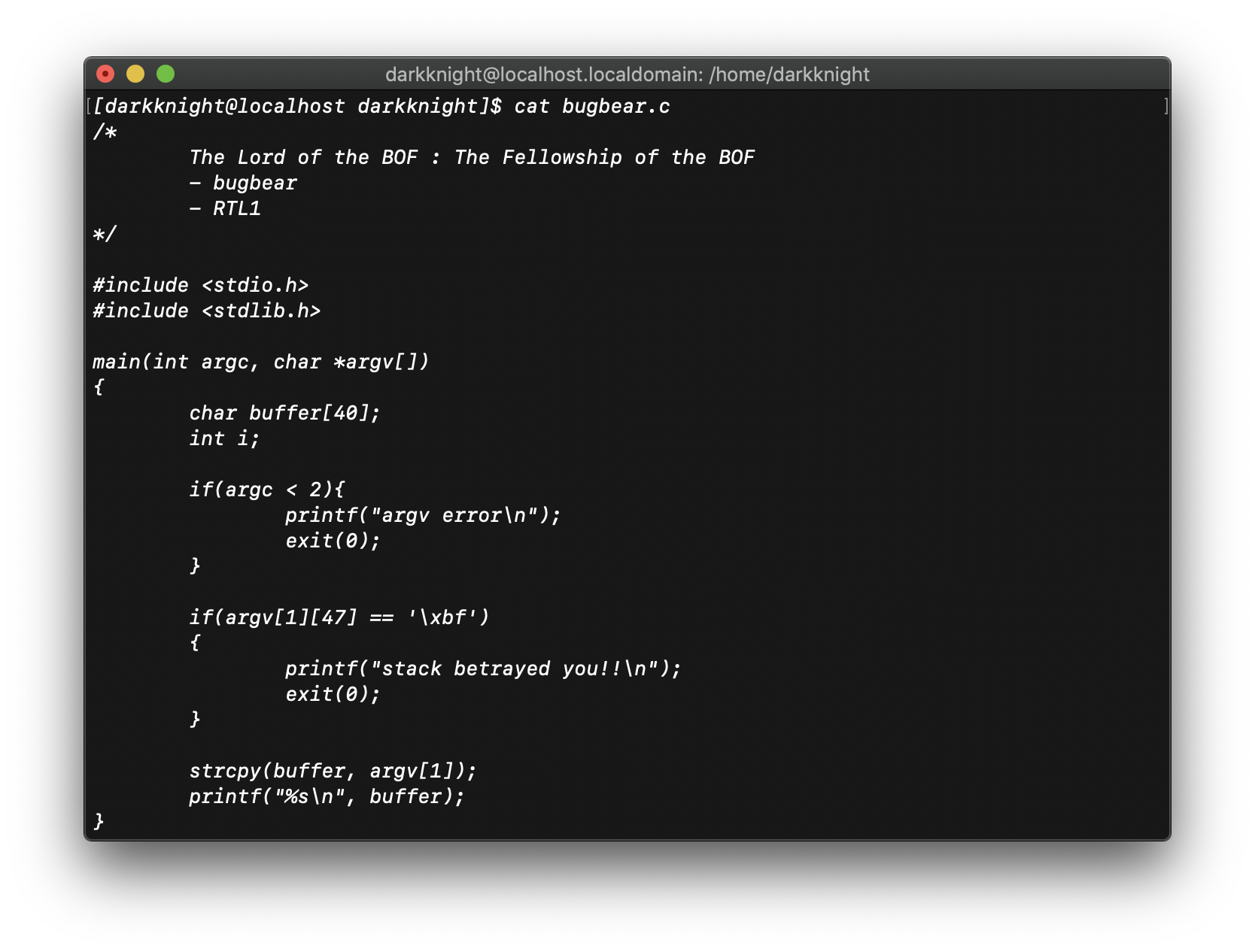 코드에서 argv[1][47] == '\xbf' 이면 프로세스가 종료되므로 우리가 사용한 일반적인 BOF로는 풀리지 않을 것 같다. 이 문제는 RTL(Rrturn To Library) 기법을 사용하는 문제인 것 같다. 우선 RTL 기법에 대해서 알아보자.