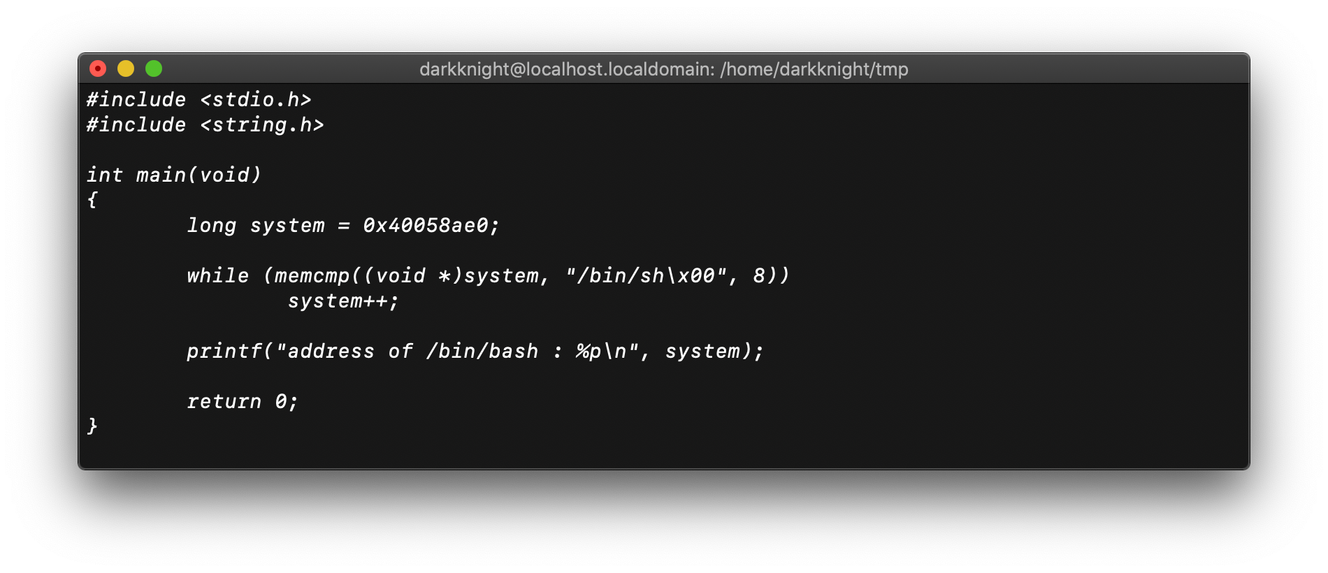 우선 RET 자리에 덮을 system 함수 주소와 parameter 자리에 넣을 "/bin/sh" 문자열의 주소를 구해보자.