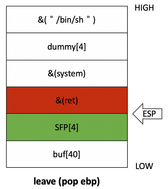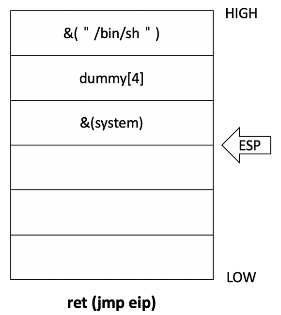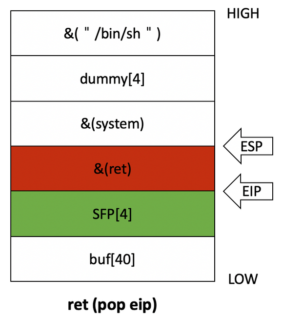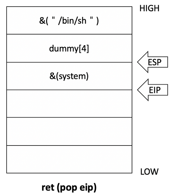 또한 함수의 epilogue 는 leave + ret 명령어로 이루어져 있다. 여기서 ret 명령어는 pop eip, jmp eip로 이루어져 있는데, 이 ret 명령어를 두 번 연속으로 실행되게 하고 RET + 4 위치에 &(system) + dummy + &(“/bin/sh”) 가 있다면 두 번의 ret 후에는 eip가 &(system)이 존재하는 주소를 가리키게 되어 jmp eip를 통하여 system 함수가 실행되게 한다. 아래 그림을 통하여 다시 이해하여 보자.