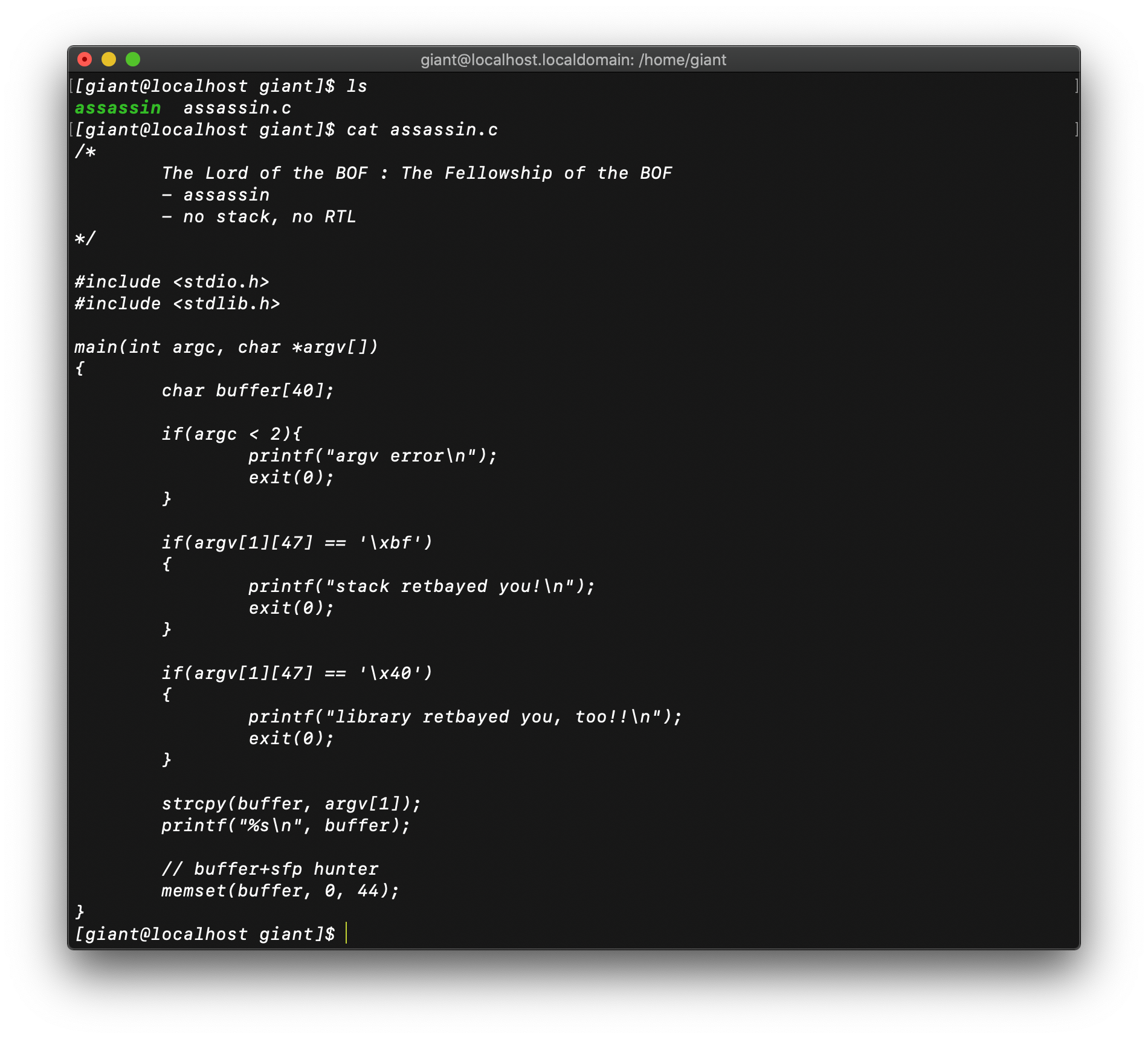 이 문제에서는 argv[1][47] == '\x40' 인 것으로 보아 0x40xxxxxx 영역을 사용하는 외부 라이브러리 함수의 주소를 RET에 덮는 방식은 사용할 수 없을 것 같다. 또한 argv[1][47] == '\xbf’ 로 보아 shellcode 를 export 하여 그의 주소를 ret에 덮을 수도 없을 것 같다. 그렇다면 RET은 환경변수의 주소도 아니고 라이브러리 함수의 주소도 아니다. 이때 사용하는 것이 RET Sled이다.
