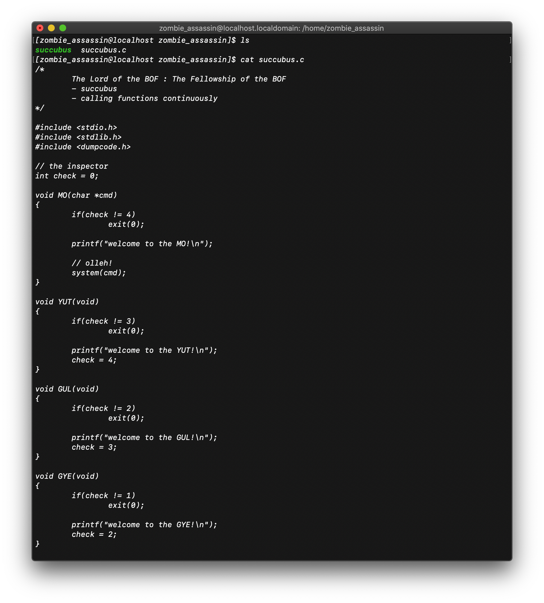 RTL Chaining 애 관련된 문제인 것 같다. RTL Chaining은 기존의 RTL 기법에서 RET + 4 영역을 다음 실행할 함수의 주소로 덮는 방법이다. 이 방법을 연속으로 사용하게 되면 RTL Chaining이 되는 것이다. 여러개의 sub 함수가 존재하고 check 라는 변수의 값이 각 함수를 지나쳐가면서 변화된다. 우선 이 문제를 해결하기 위하여 필요한 조건은 다음과 같다.