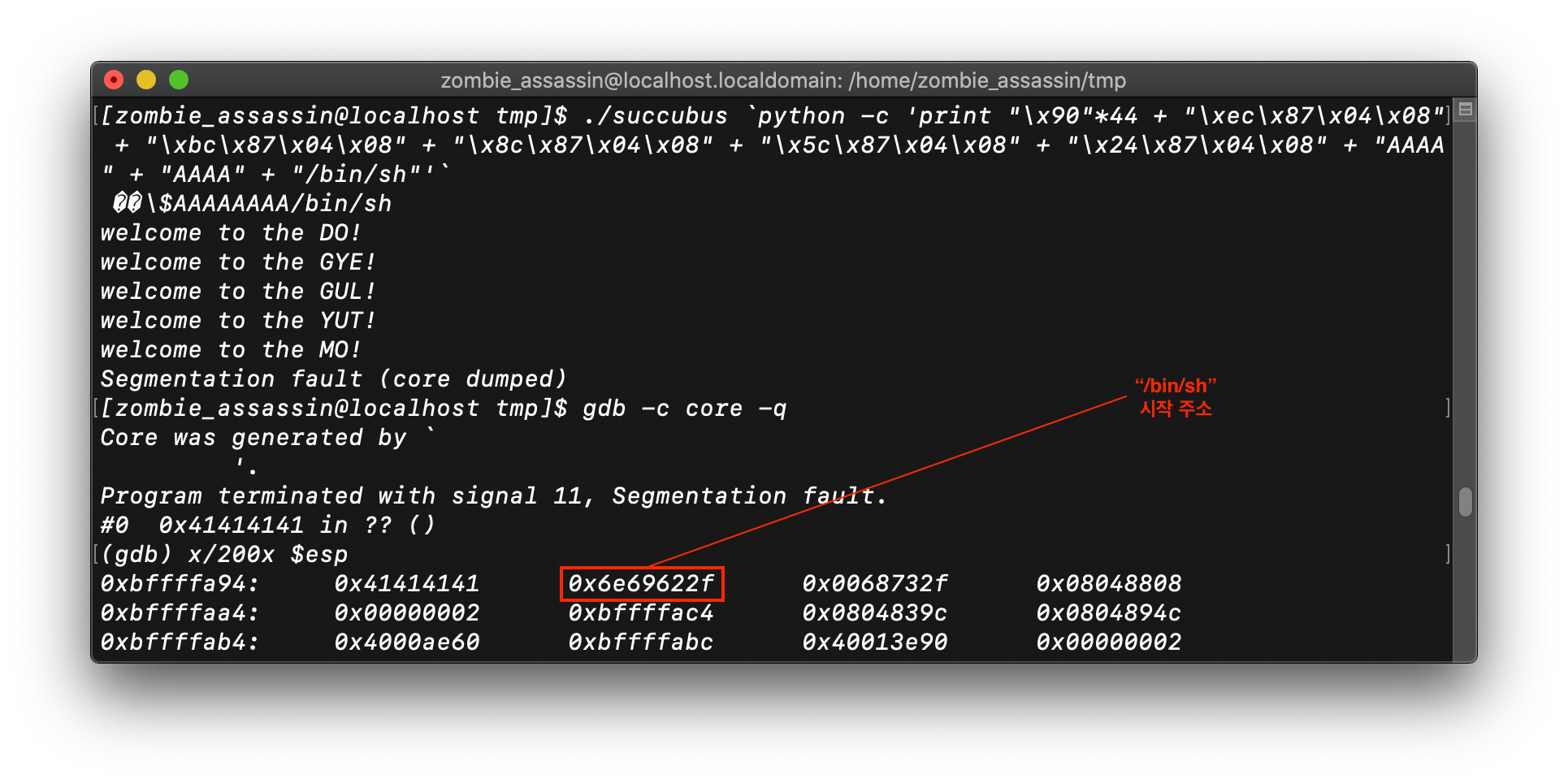우선 임시로 “/bin/sh” 의 주소를 AAAA로 넣어주어 core dump를 일으켜야겠다.