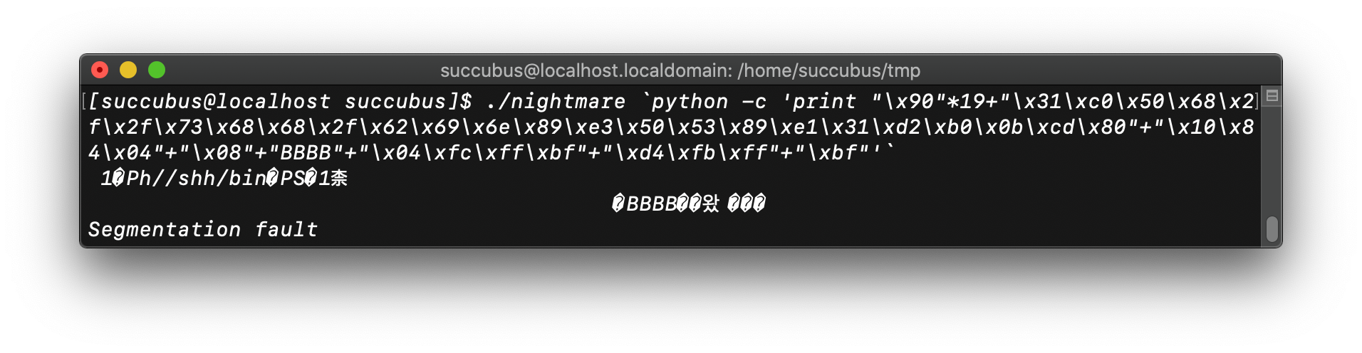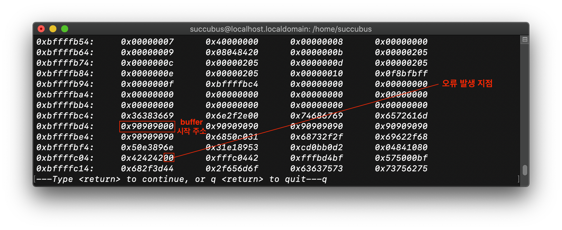 이렇게 되면 strcpy 함수가 실행되어 parameter_1(“AAAA”가 덮인 부분)에 parameter_2(&(buffer))가 들어가게 되면서 strcpy 함수의 RET이 &(buffer)로 변조되게 된다. 이로 인하여 buffer에 넣어준 NOP+shellcode 가 실행된다.
