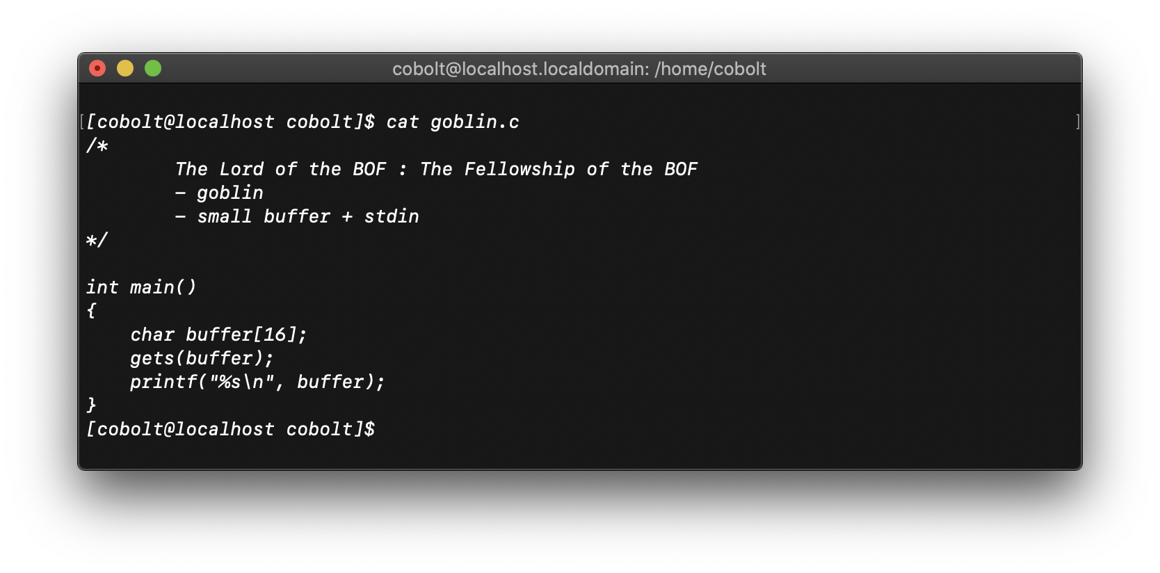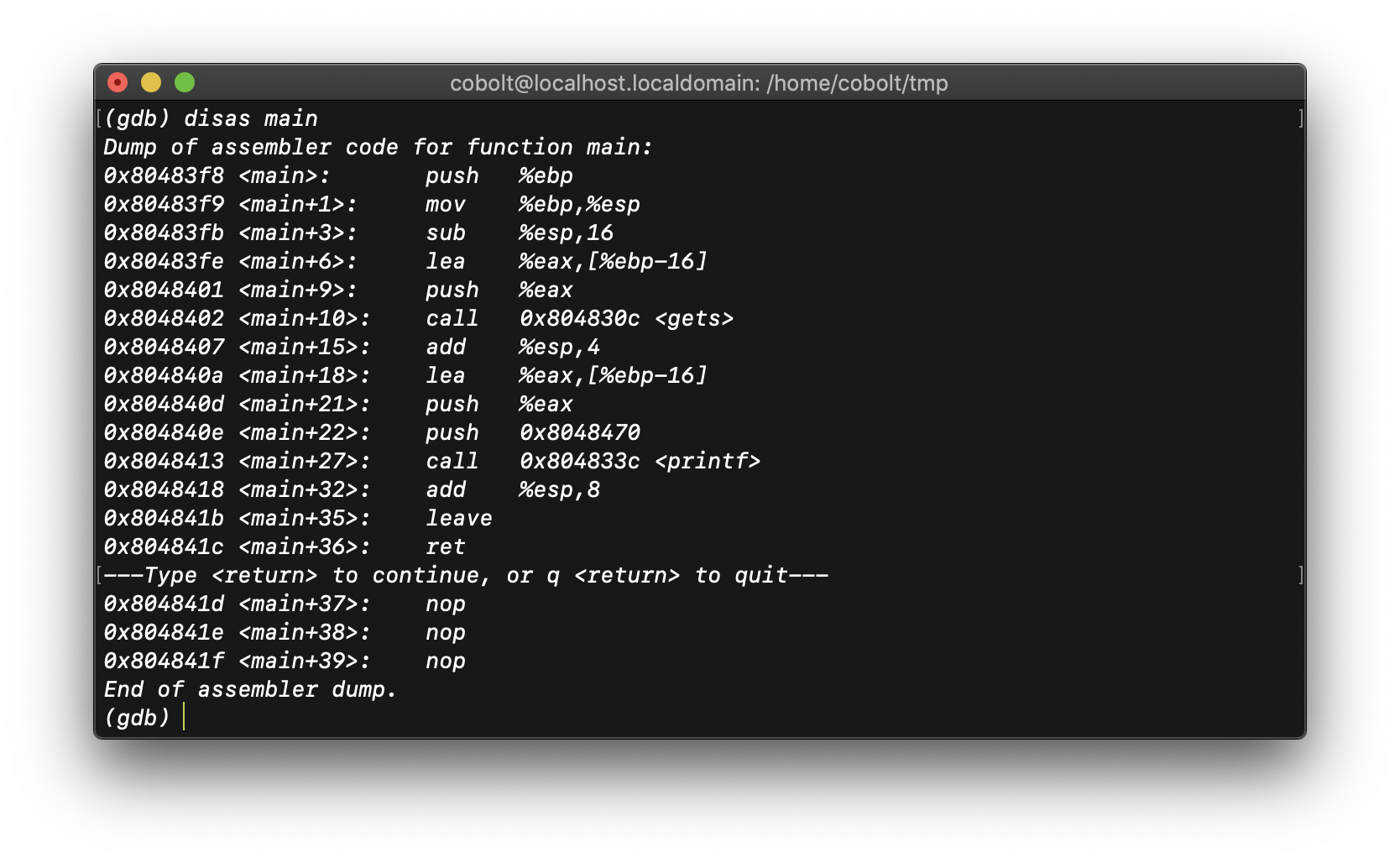 작은 버퍼와 표준입력에 대한 문제인 것 같다. cobolt의 문제와 다른 것은 인자가 아닌 표준입력을 받는 함수 gets를 사용하다는 것 뿐이다. 메모리 구조를 분석하고 바로 payload를 짜보자.