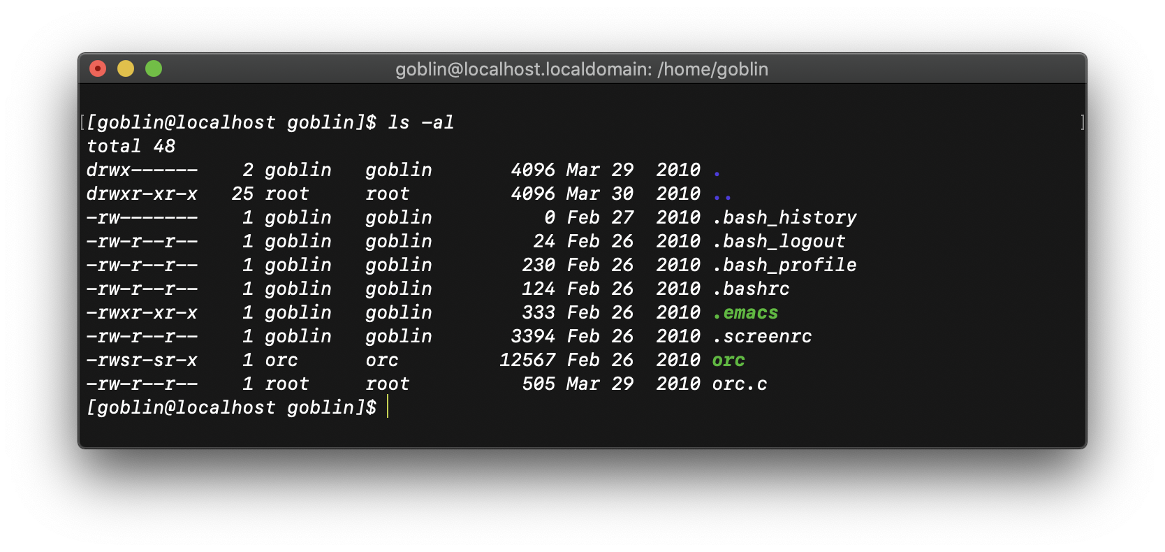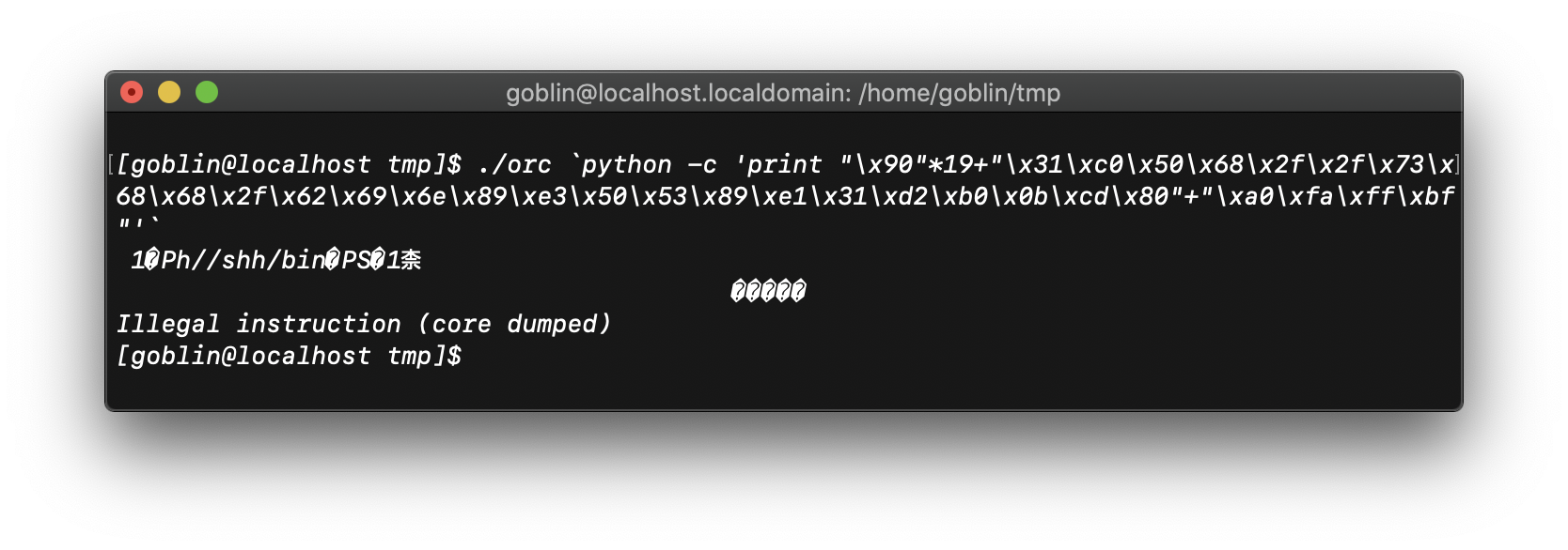 우선 orc.c 코드를 tmp에 옯겨서 새로운 프로그램의 이름으로 컴파일해보자. 여기서 주소를 확인하기 위하여 코드의 마지막 줄의 서식문자를 %s -> %p 로 바꾸자.