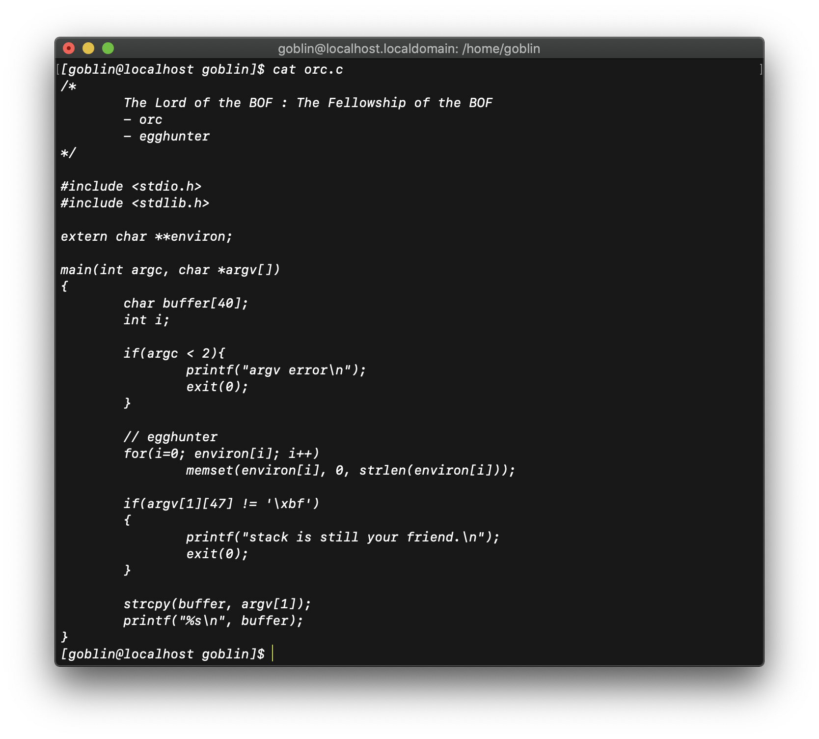 중간에는 크게 의미없는 코드인줄 알았지만 환경변수를 모두 0으로 만들어서 환경변수를 쓰지 못하게 만들고 있다. 즉 전에 썼던 export를 사용하지 못한다. 또 egghunter 라는 것을 보니 환경변수는 못 쓸 것 같다.