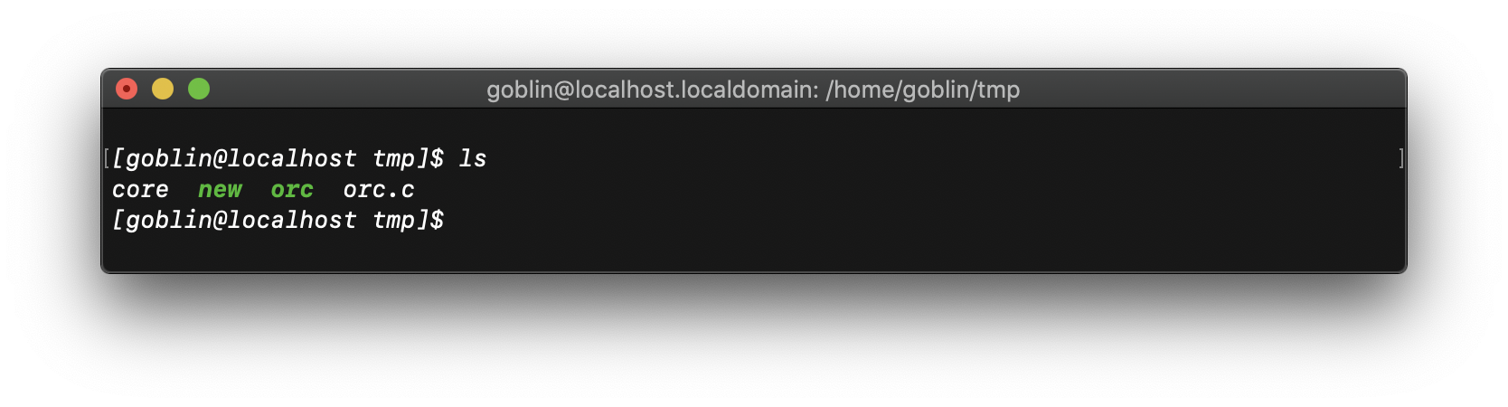 우선 orc.c 코드를 tmp에 옯겨서 새로운 프로그램의 이름으로 컴파일해보자. 여기서 주소를 확인하기 위하여 코드의 마지막 줄의 서식문자를 %s -> %p 로 바꾸자.