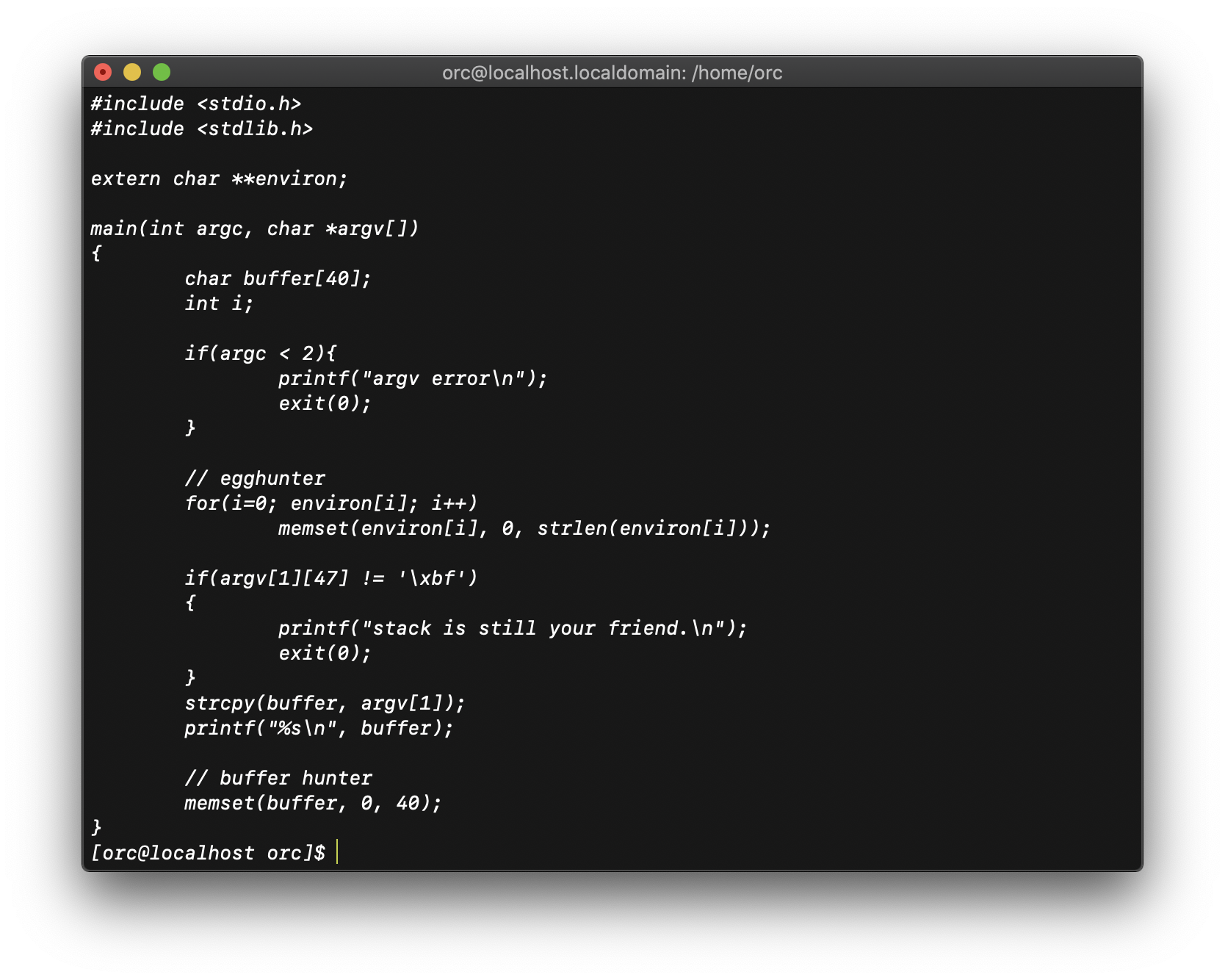 먼저 ret 주소를 덮을 buffer의 시작 주소를 구해보자. 우선 wolfman.c 코드를 수정하여 buffer 의 주소를 출력하는 프로그램을 만들어서 실행해보자.