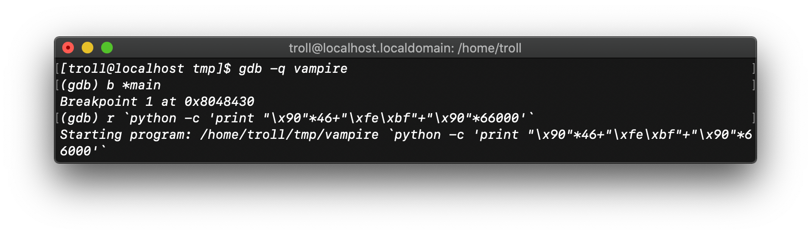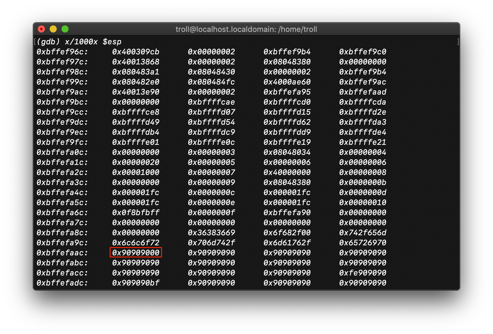 그럼 어디까지 증가시켜야 할까? 보통의 프로그램을 실행하게 되면 거의 모든 메모리 영역이 0xbfffxxxx 으로 시작하는 것을 볼 수 있다. 또한 argv[1][46] = '\xff' 이 되면 안되므로 인자의 길이를 약 0x10000 증가시키면 메모리 영역이 0xbffexxxx 이 될 것이다. 그럼 프로세스를 종료시키지 않는 조건만을 채운 뒤에 gdb로 실행하여 적절한 주소를 찾아보자.