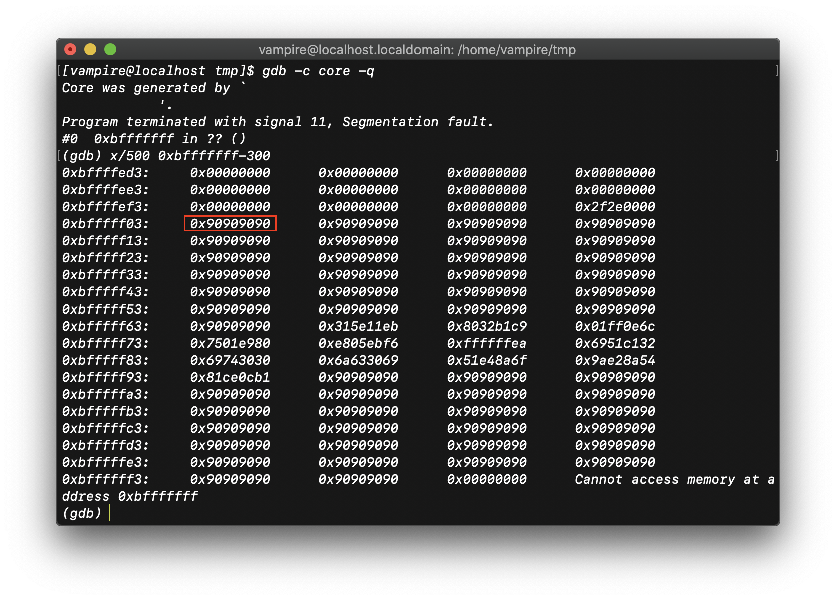 core dump 가 일어났다. 이제 core 파일을 분석하여 정확한 argv[0] 의 주소를 찾아내자.