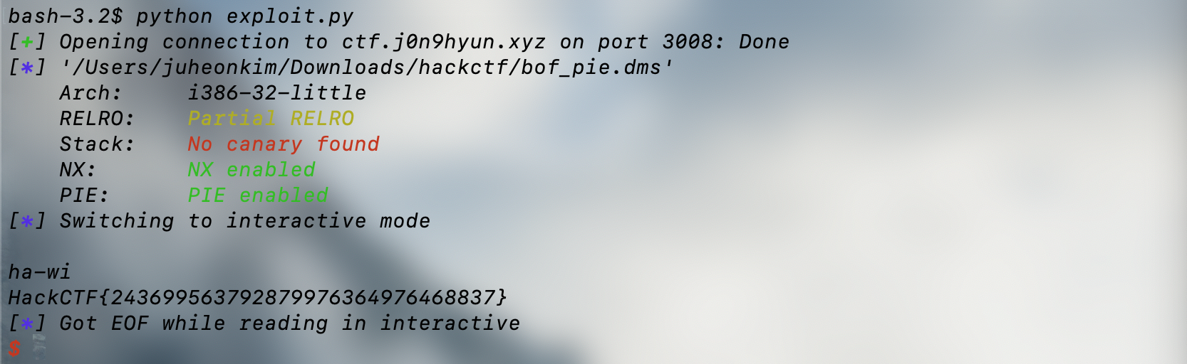 간단하게 welcome 함수의 RET을 j0n9hyun의 주소로 덮으면 될 것 같다. 각 함수들의 심볼들을 이용하여 offset을 계산한 뒤, j0n9hyun 함수의 주소를 payload에 넣으면 될 것 같다. (메모리 구조 생략)