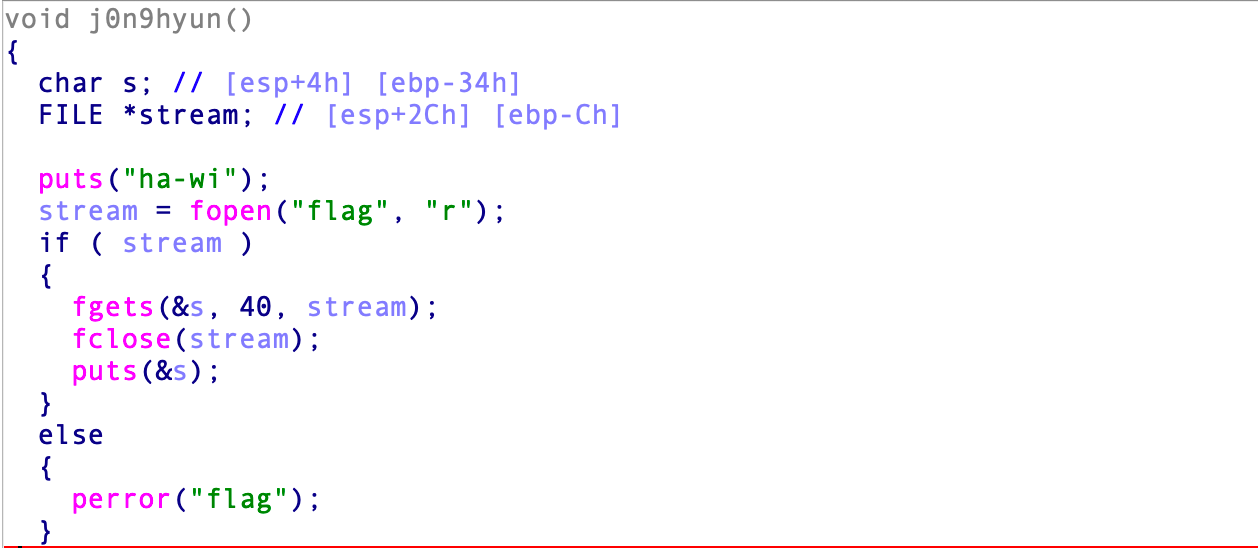 j0n9hyun 함수는 flag를 출력하는 함수이다.
