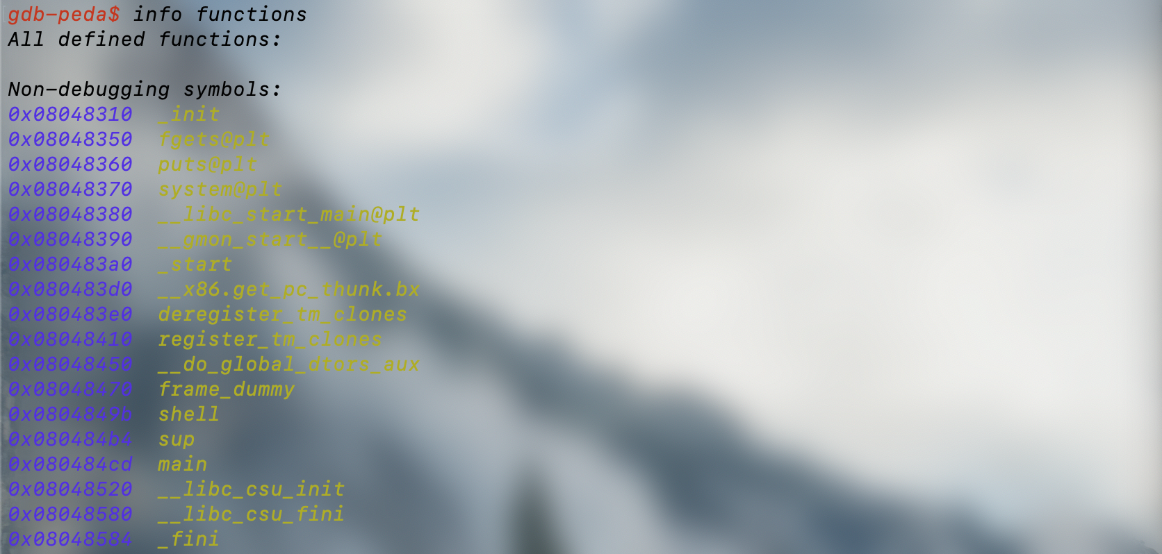 v5가 함수 포인터로 선언되어 있으므로 v5 자리에 쉘을 실행시키는 함수를 넣으면 될 것 같다. gdb로 분석하여 다른 함수들이 존재하는지 살펴보자.