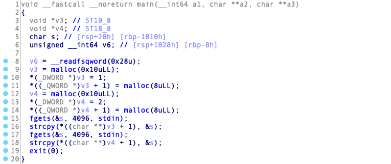 main 함수부터 보자. 첫번째 fgets 로 입력받는 값은 v3 + 1 에 저장되고, 두번째 fgets 로 입력 받는 값은 v4 + 1 에 저장된다. 첫번째 입력에서 v3, v3 + 1, v4 를 NOP 로, v4 + 1 을 exit_got 로 입력해주면 될 것 같다. 메모리 구조를 살펴보자.