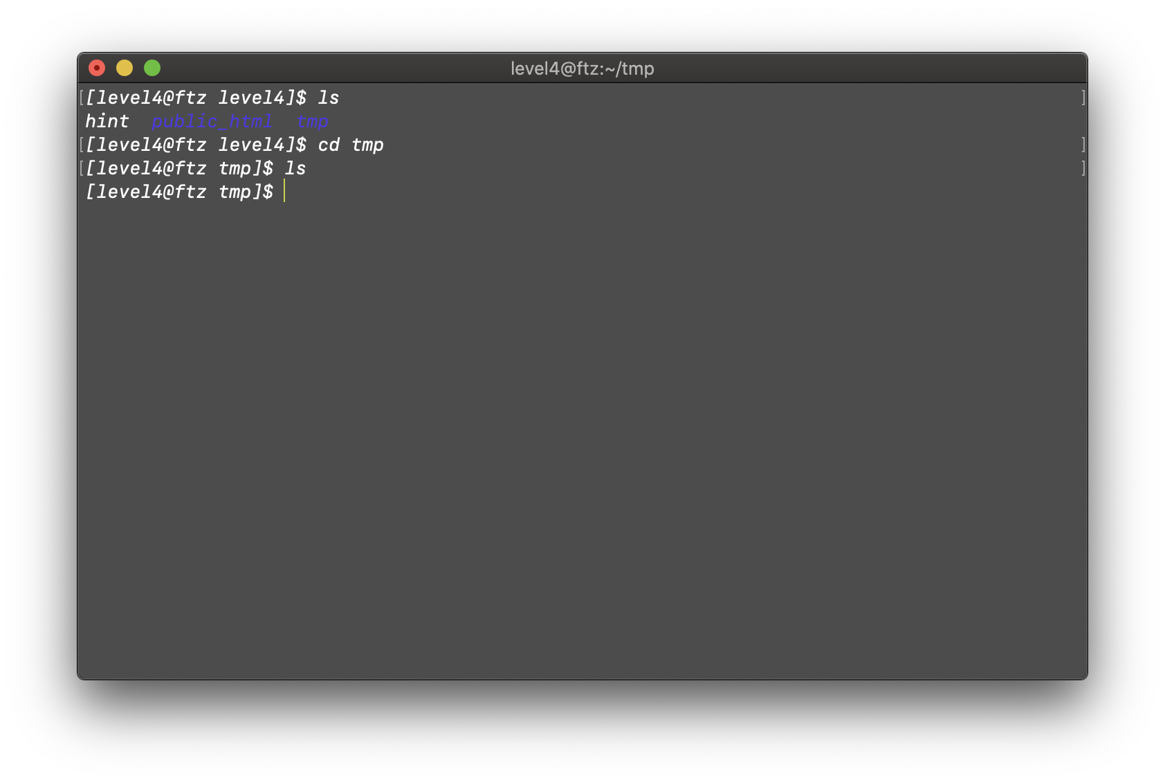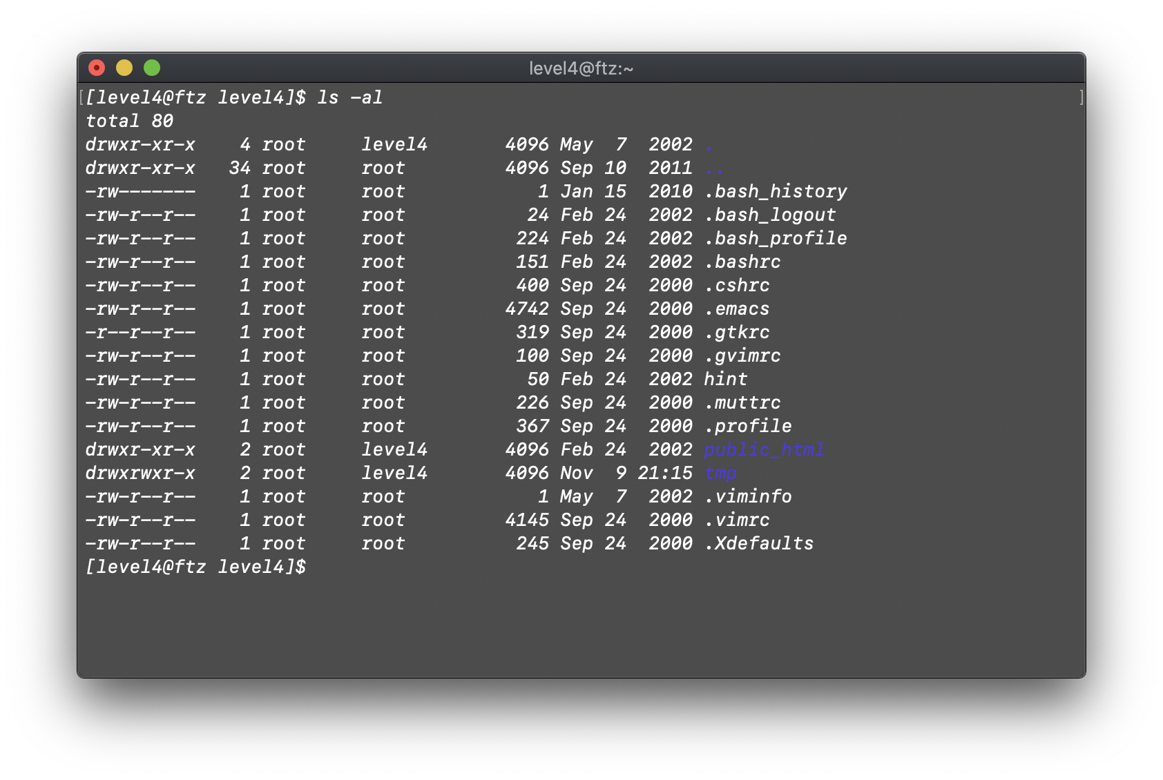 그럼 먼저 backdoor 에 정의되어 있는 것처럼 /home/level4/tmp/backdoor 의 경로로 이동하여 어떤 파일이 있는지 살펴보자.