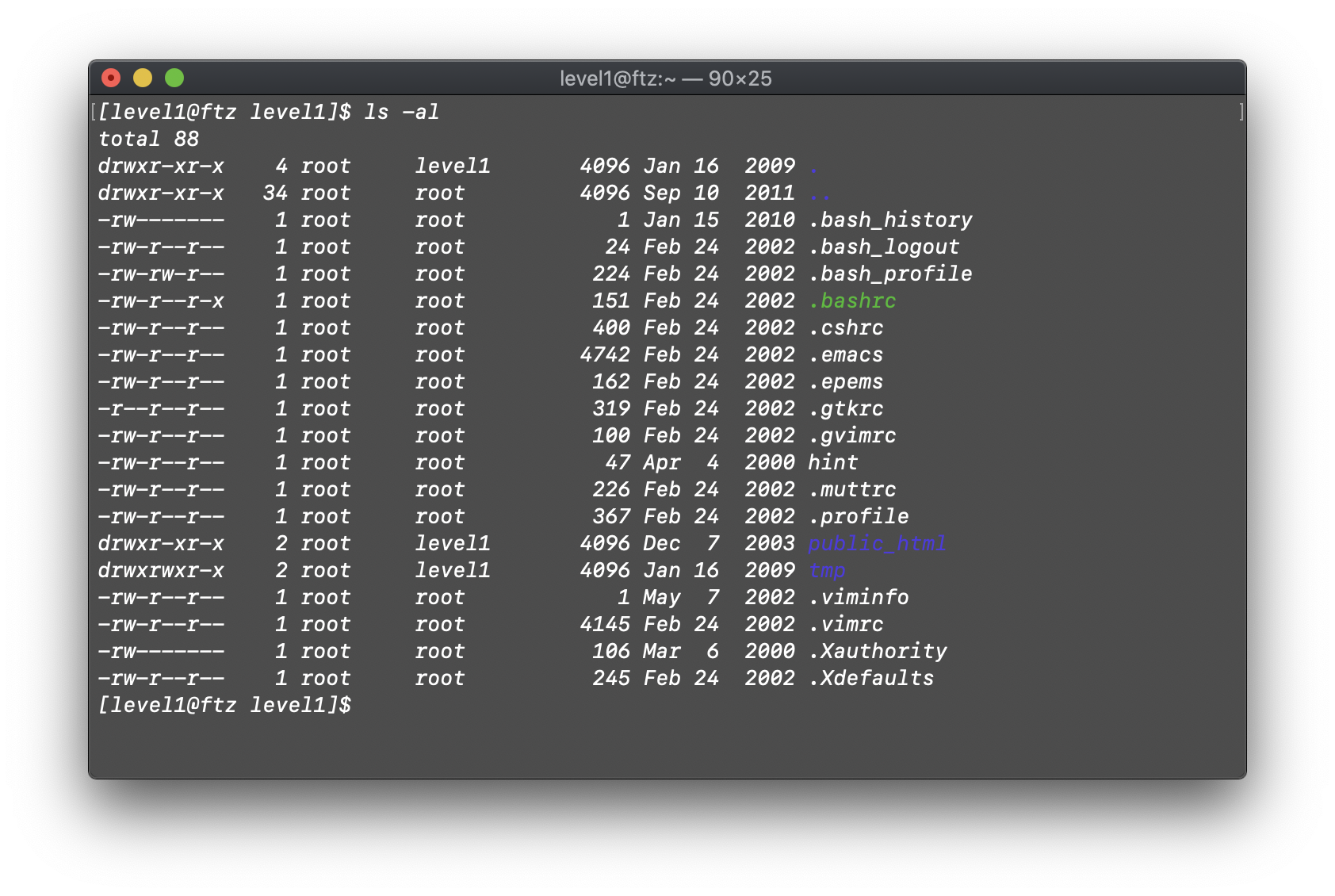 우선 level1에 접속한 다음 숨겨진 파일을 포함하여 출력하도록 하자.