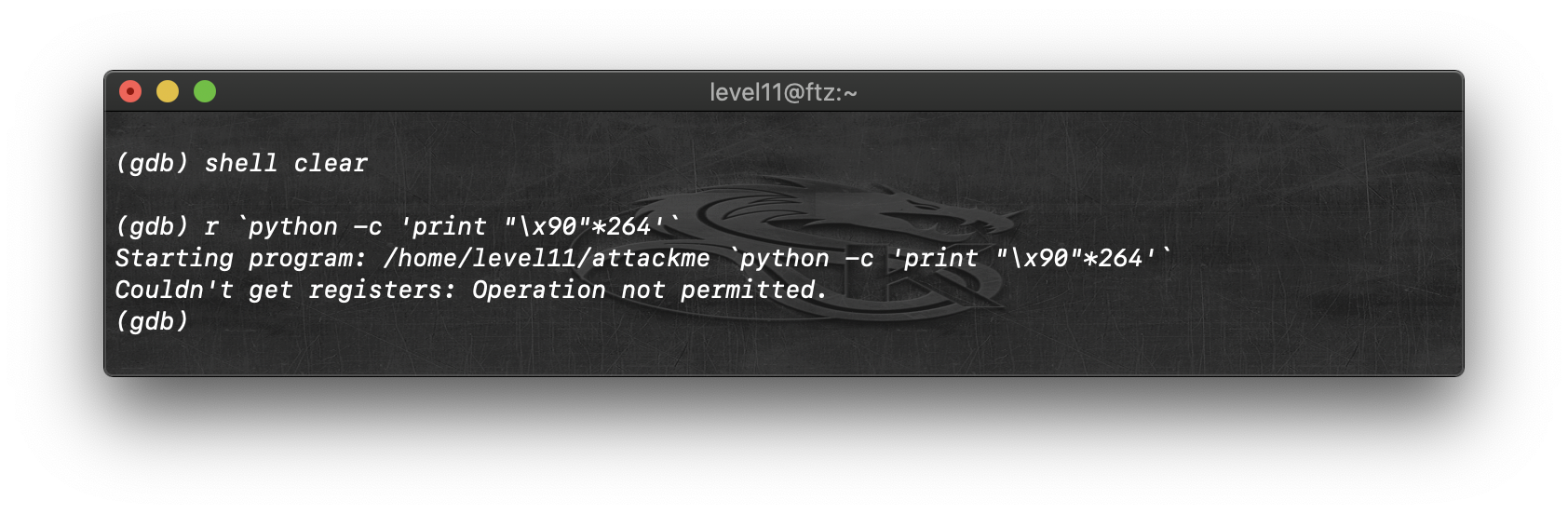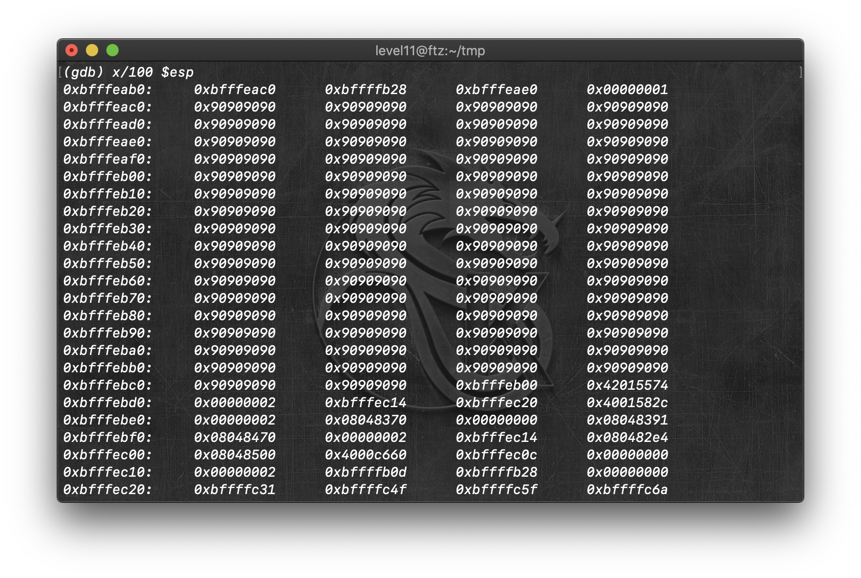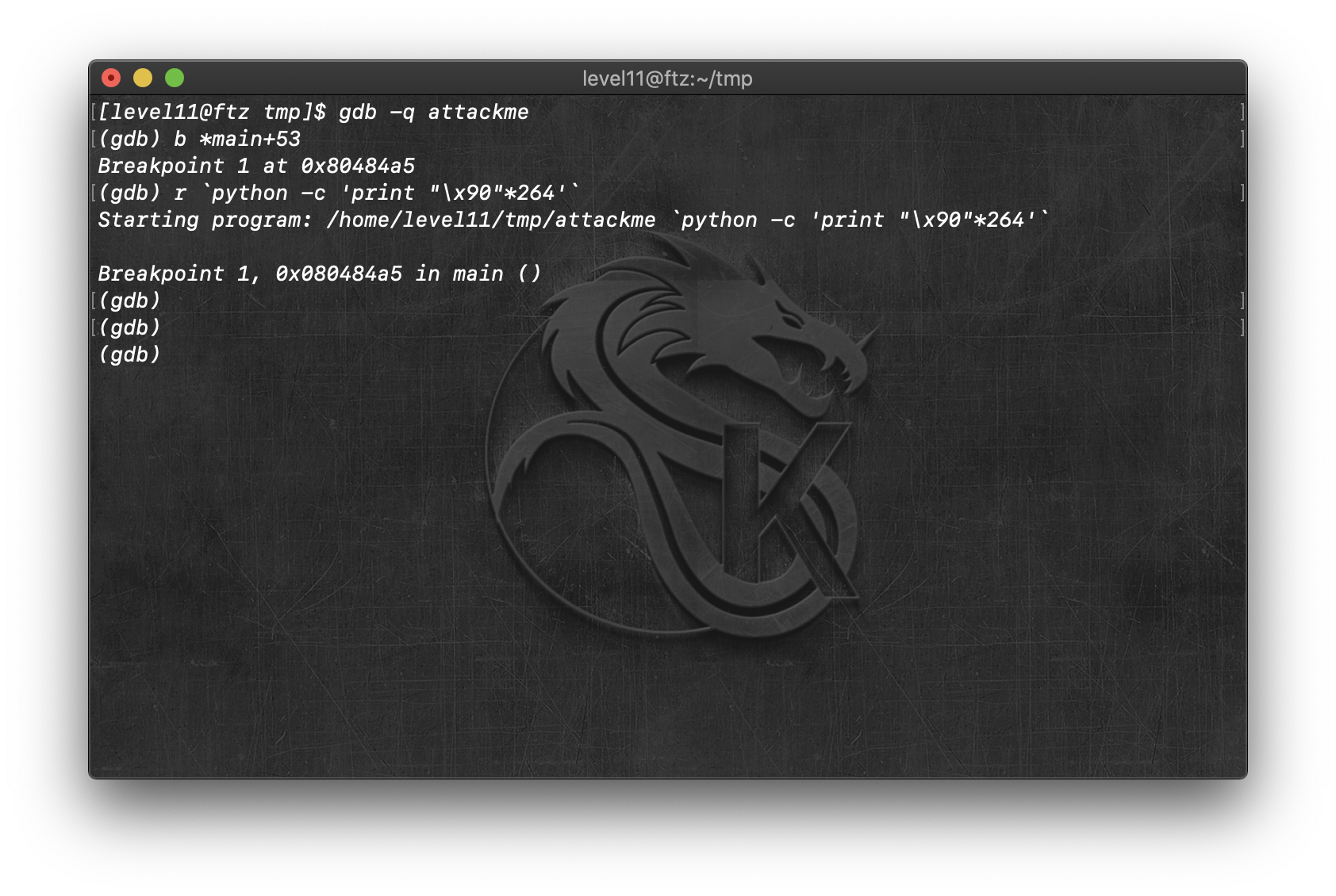 0xbfffeac0 부터 0x90이 채워진걸 볼 수 있다. 따라서 str의 시작주소는 0xbfffeac0 인걸 알 수 있다. 이제 다시 original attackme로 가서 실행해보자.