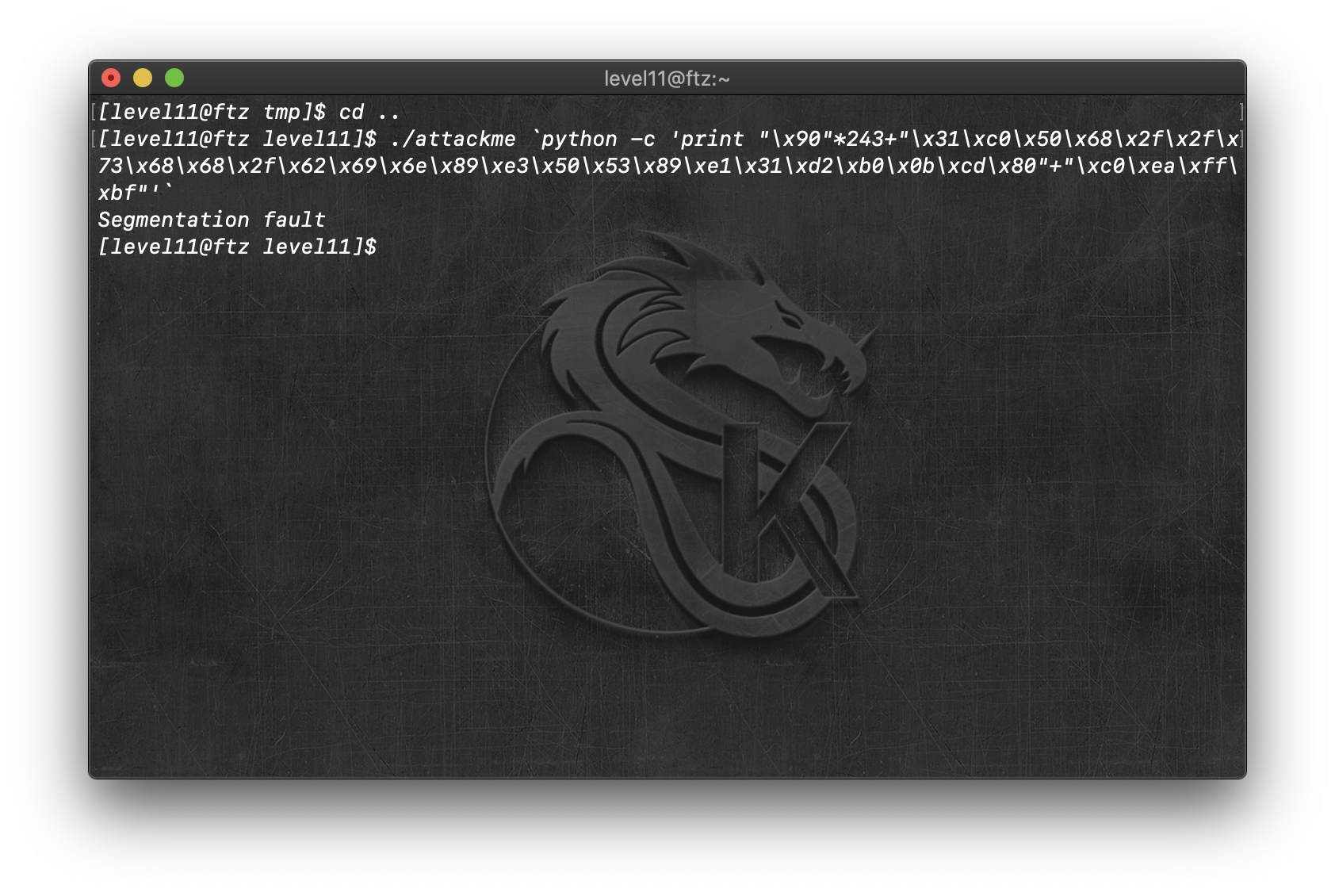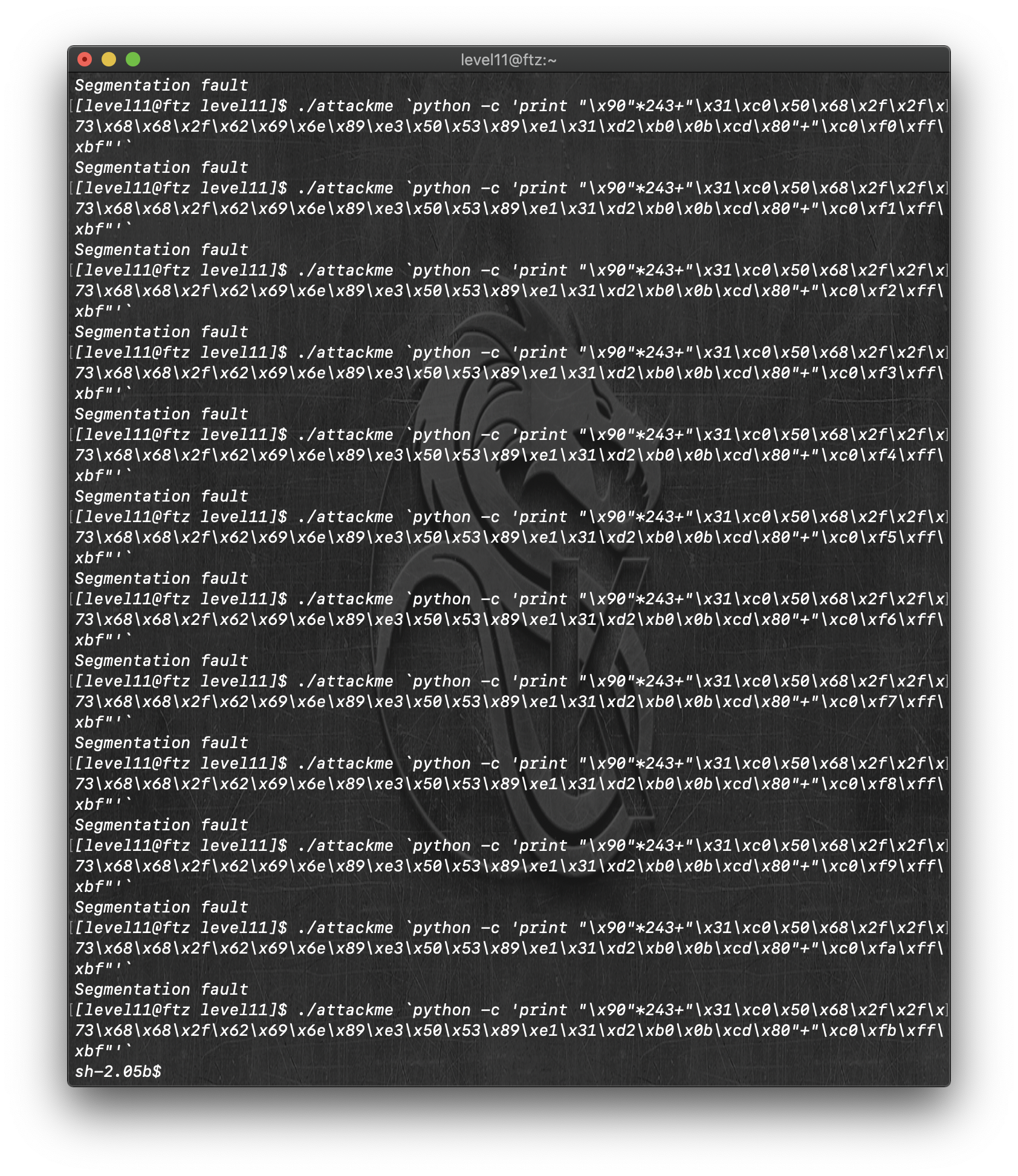 그러나 segmentation fault가 떴다. ftz에는 ASLR 보호 기법이 적용되어 있기 때문에 계속해서 버퍼의 주소가 변경된다. 따라서 마지막 ret 주소, 즉 변화하는 str 주소를 값을 계속 변경해주어 실행한다.