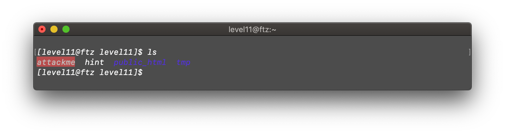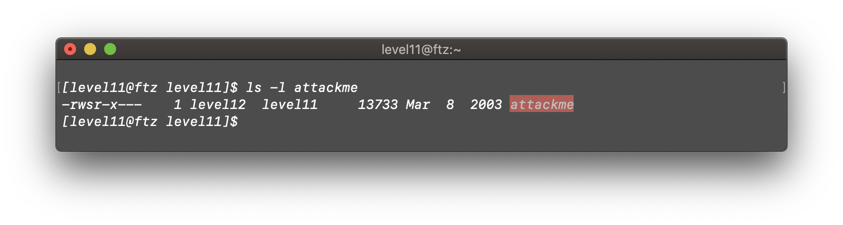attackme 라는 실행파일이 존재하나 level11의 권한에서는 실행과 읽기권한만 존재한다.