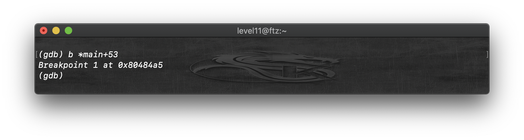 우선 strcpy 함수가 호출된 이후 str에 argv[1] 값이 복사되서 저장되기 전인 main + 53 부분에 bp를 걸어주자. (bp를 걸어주게 되면 해당 부분 바로 전까지만 프로그램이 실행됨)