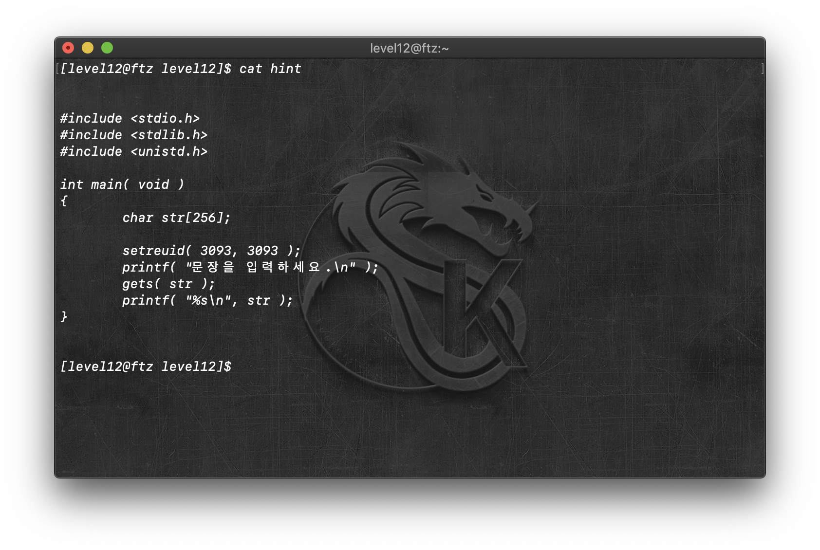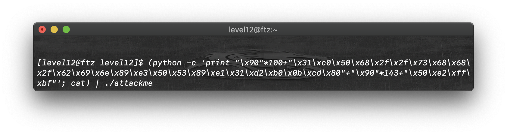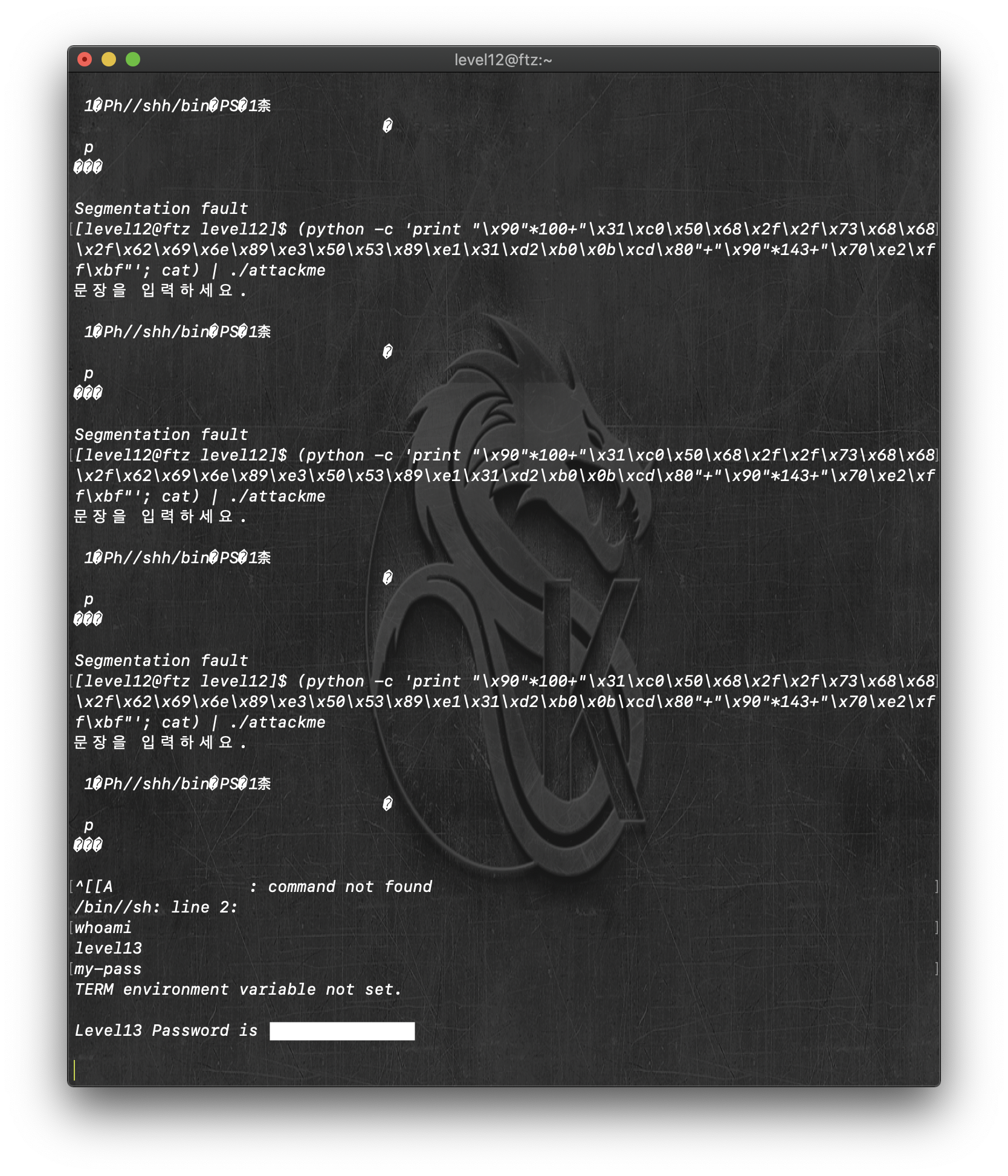 level12에도 ASLR이 걸려있다. 한번에 쉘이 뜨지 않는다. 따라서 str의 주소값을 계속 증감시켜 쉘이 뜰 때까지 반복한다. 이 역시 나중에 RTL을 이용하여 ASLR을 우회할 것이다.