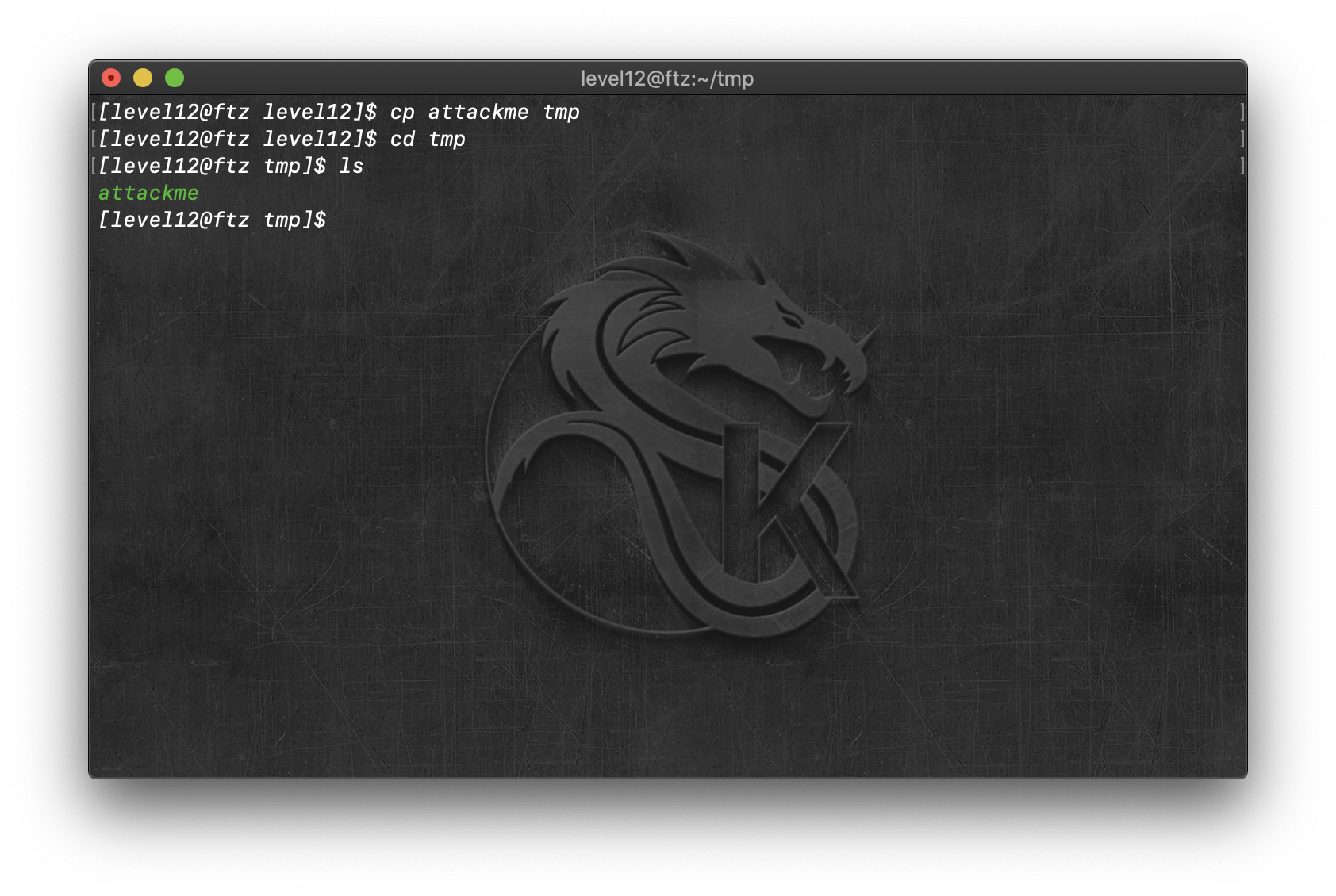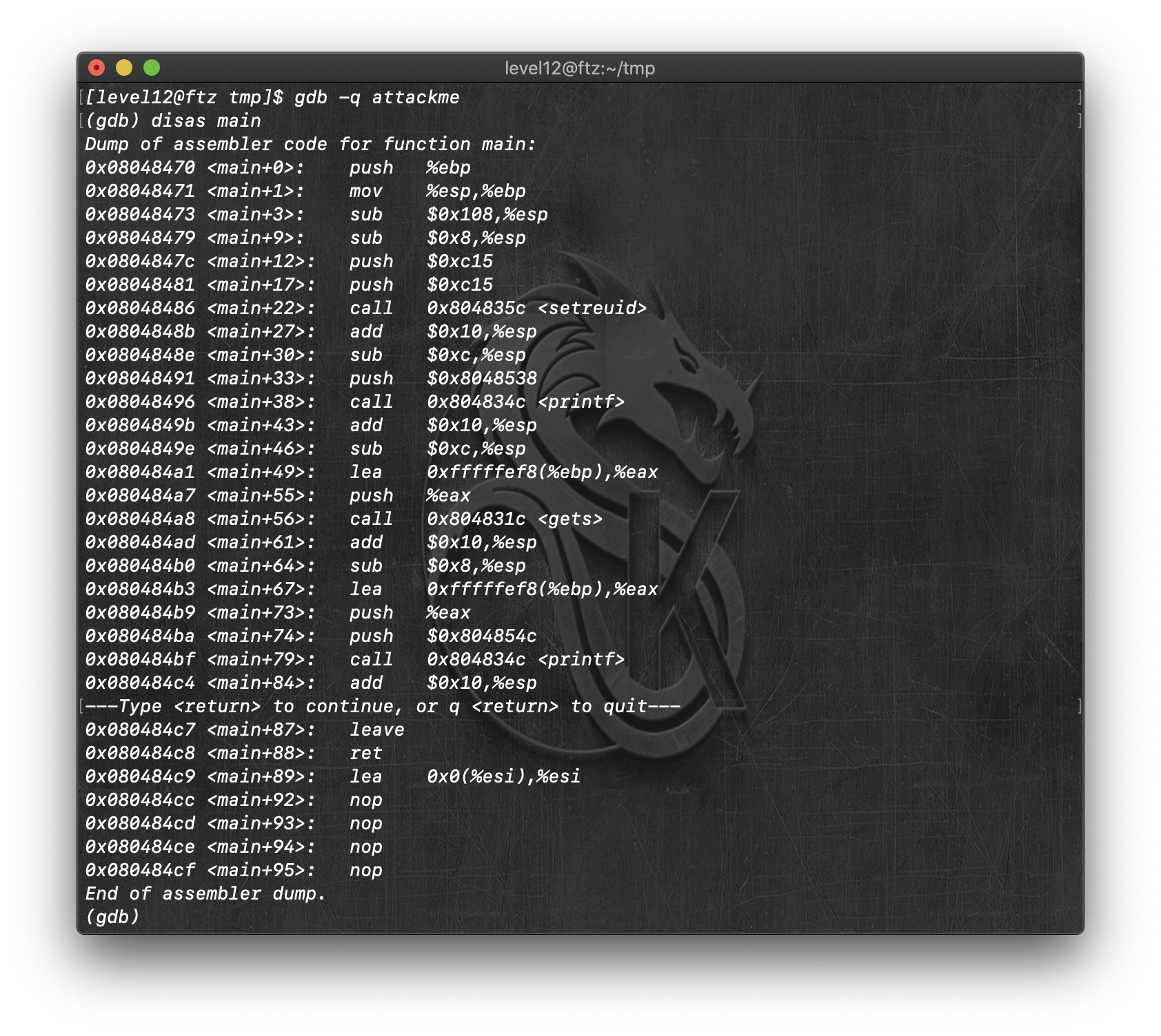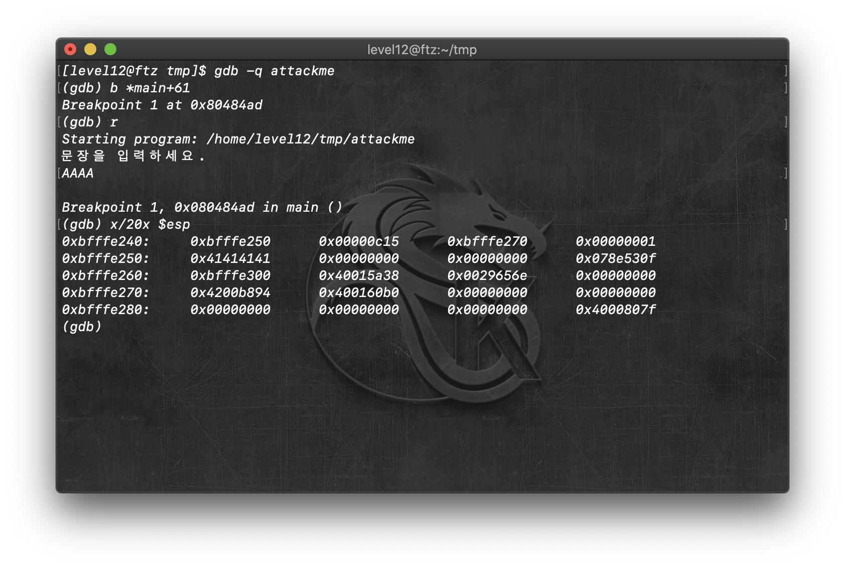 level11과 버퍼의 크기도 같으므로 메모리 구조도 다음과 같을 것이다. 정확성을 위하여 gdb를 이용하여 프로그램을 살펴보자. original attackme는 gdb 권한이 거부되어 있으니 프로그램을 tmp로 복사하여 뜯어보자.