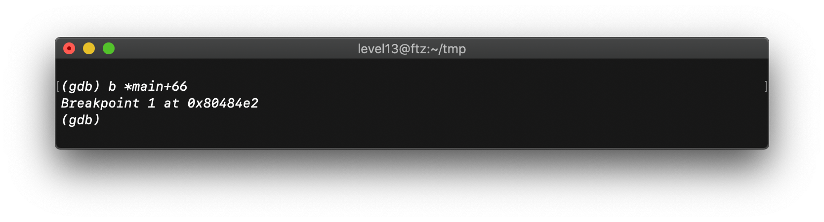 buf의 시작 주소를 구해야 하므로, 우선 strcpy 함수가 호출된 다음인 main + 66 부분에 break point 를 걸어준다.