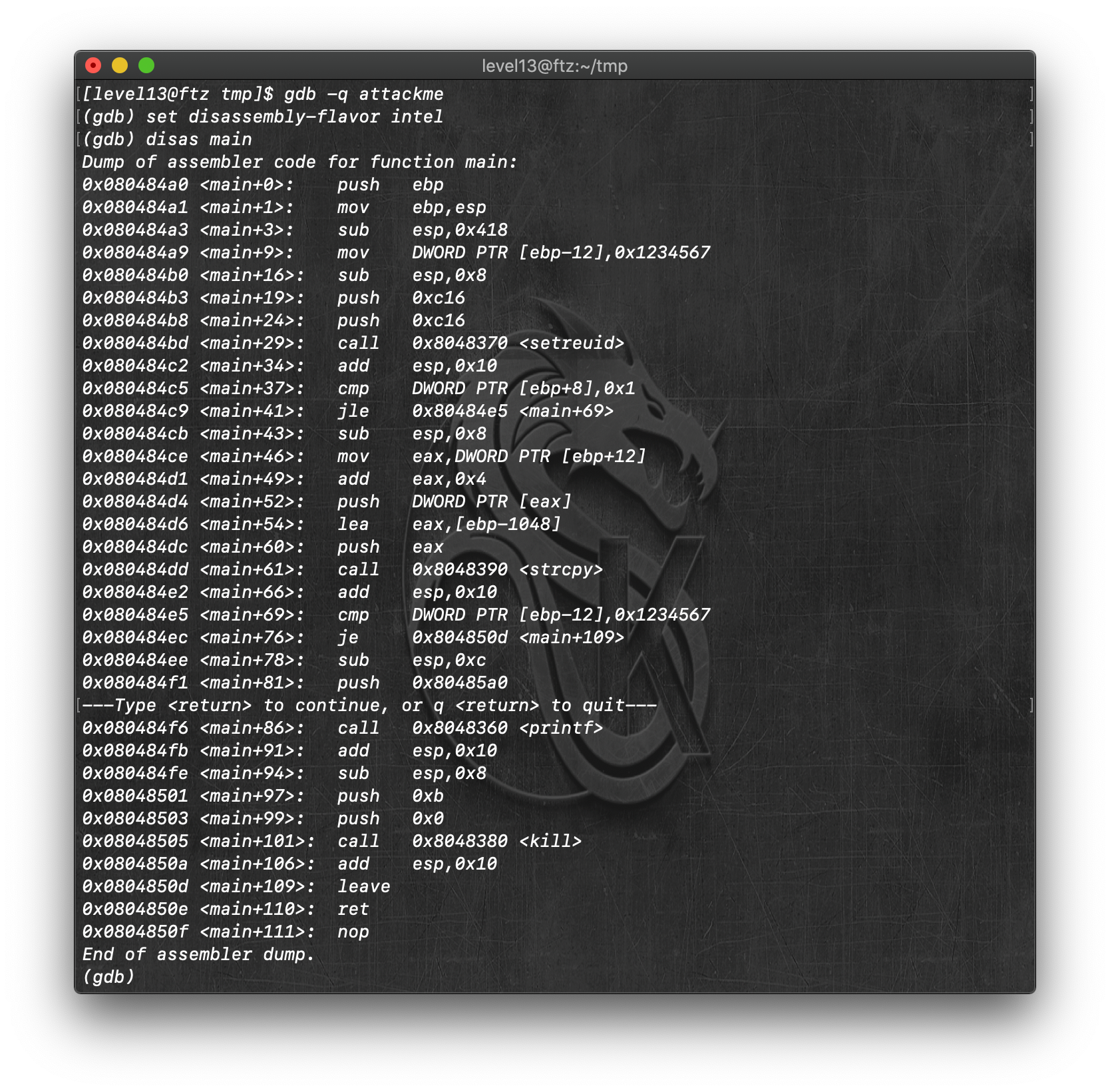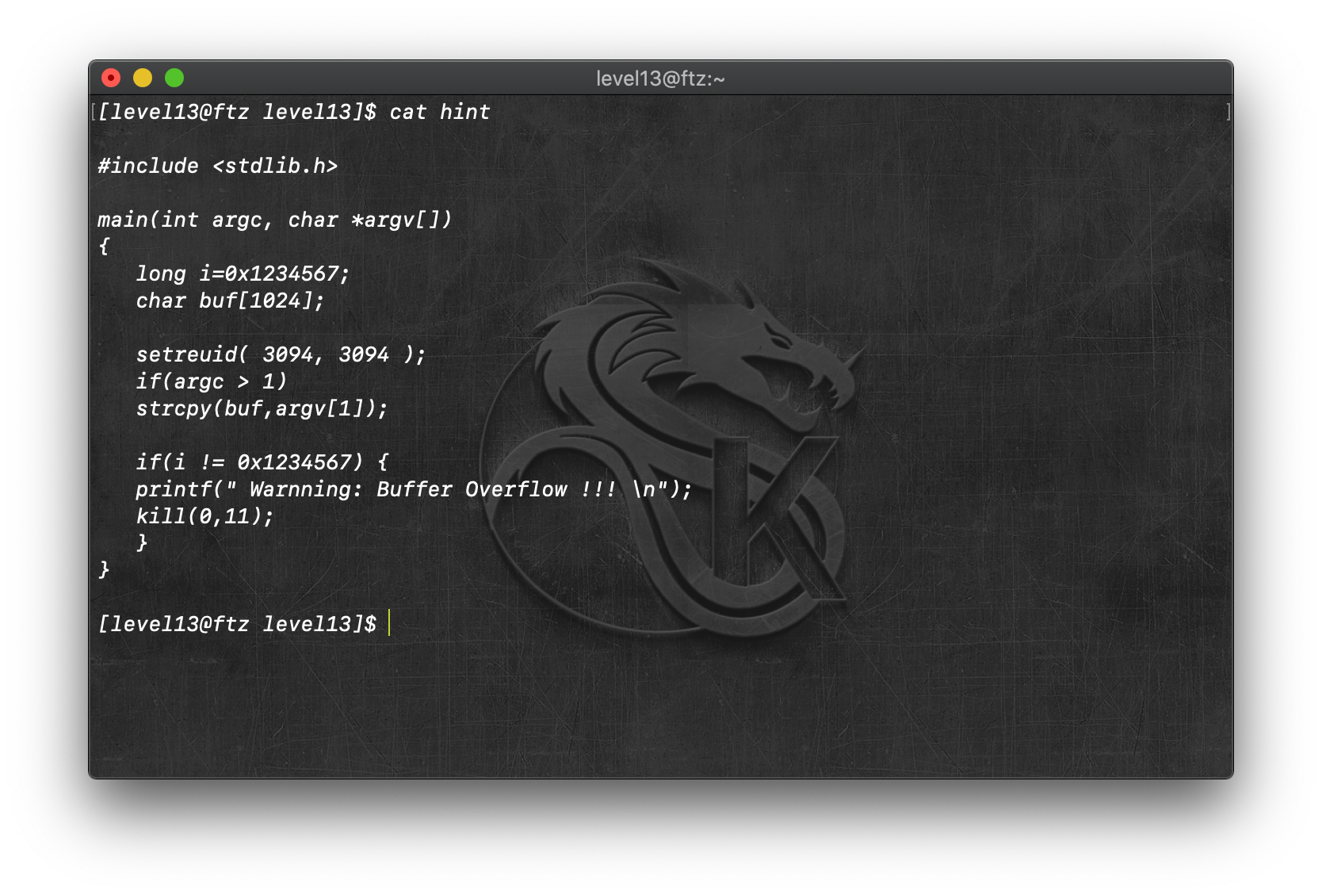 | FTZ - level14 [Buffer Overflow 𝜹] (0) | 2020.08.28 |