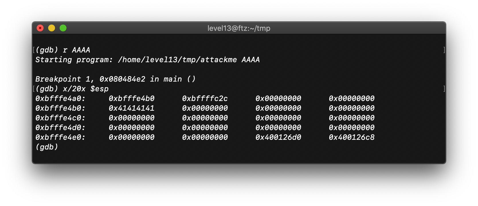 buf의 시작 주소는 0xbfffe4b0 임을 확인하였다.