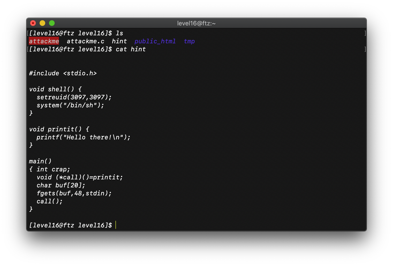attackme.c 이라는 파일이 있지만 읽기 권한이 거부되어 있다. 그냥 attackme의 소스 코드인 것 같다. hint의 코드를 살펴보자.