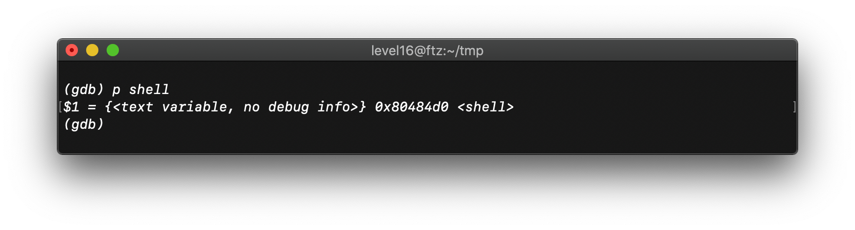 이제 shell 함수의 주소를 구하자. gdb에는 프로그램에 저장된 함수나 새롭게 선언한 함수의 이름으로 그의 주소를 출력해주는 기능이 있다.