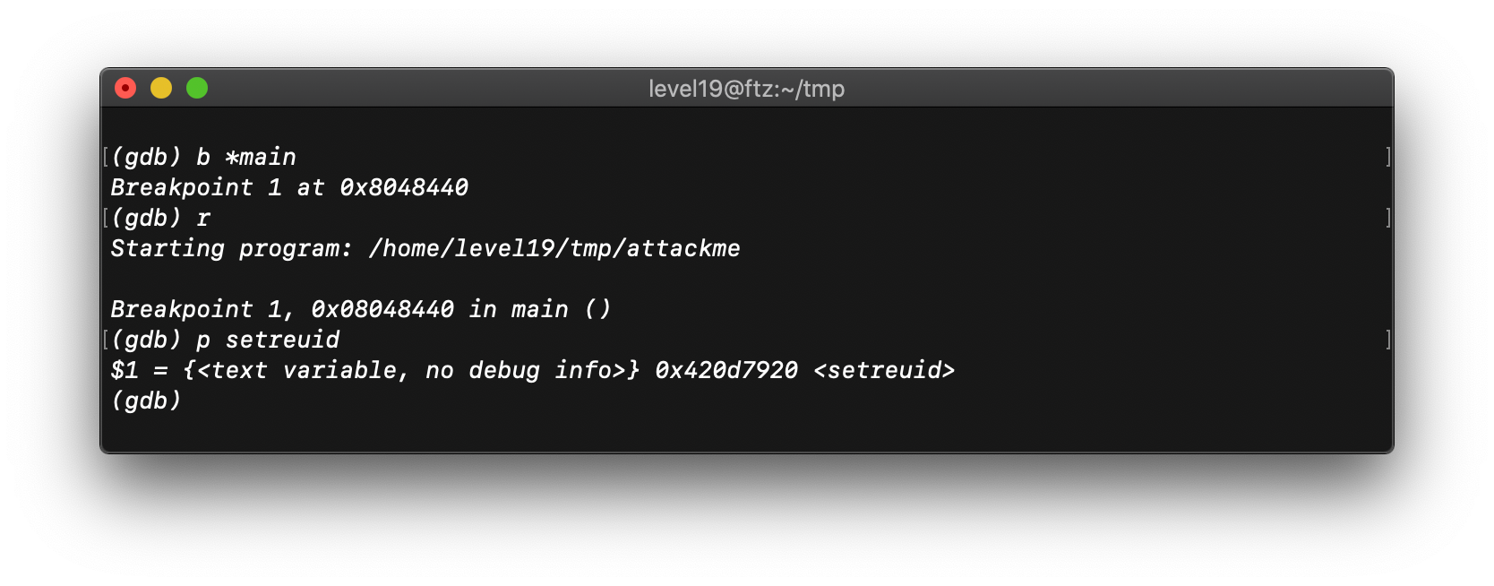 우선 tmp 디렉토리에 attackme 프로그램을 복제해주고, gdb를 통하여 attackme 프로그램의 메모리 구조를 살펴보자.