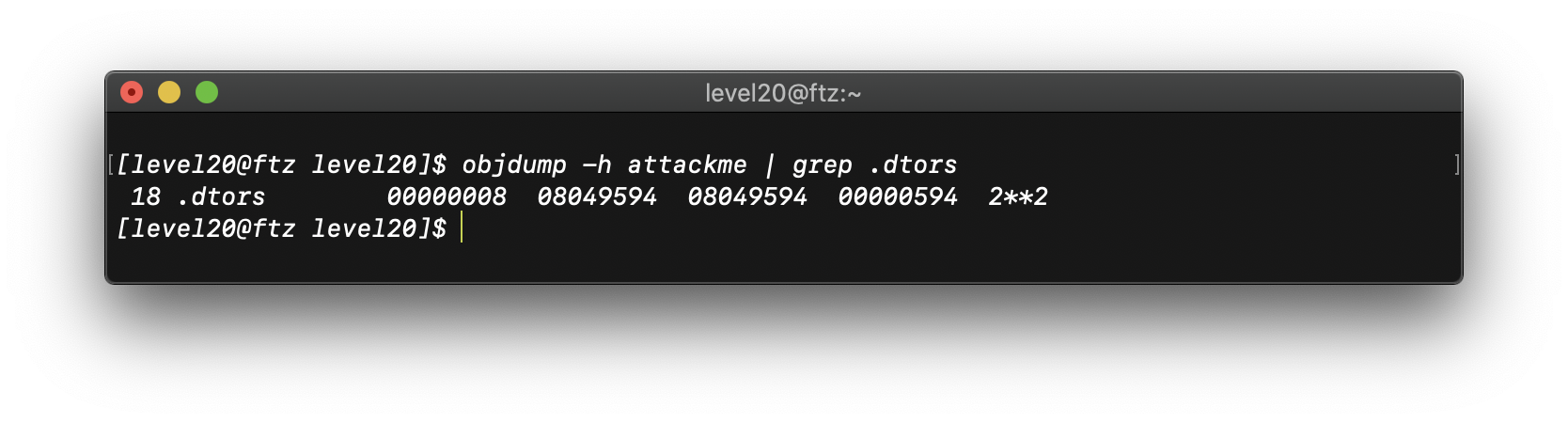 따라서 바이너리 파일들의 정보를 보여주는 objdump 명령어를 통하여 .dtors의 주소를 찾아내자.