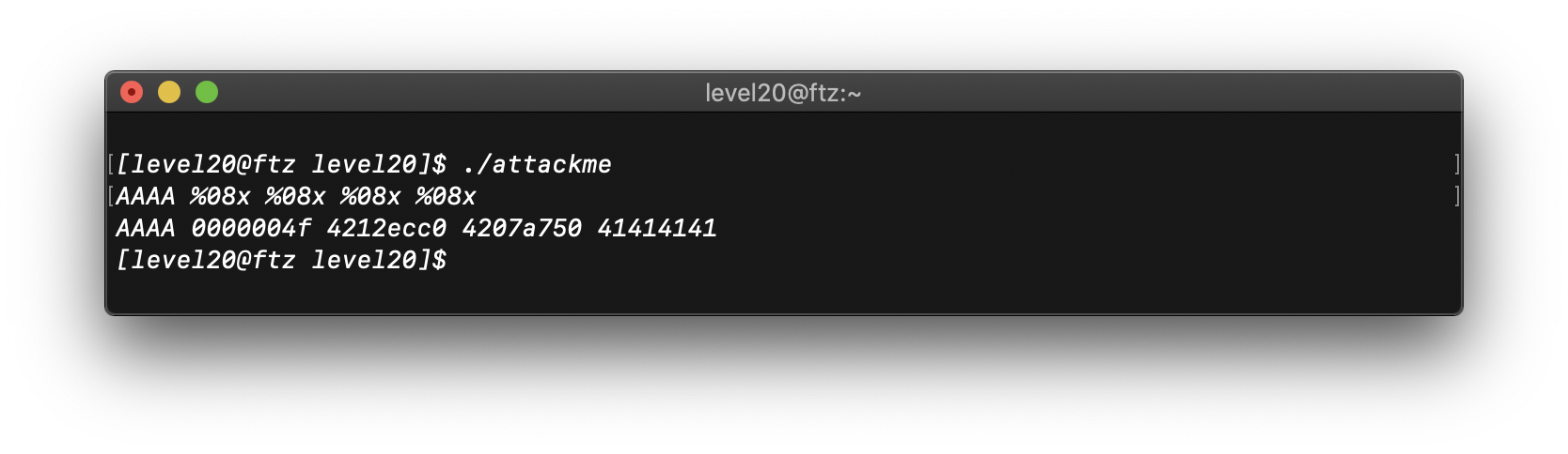 - 그 뒤에 %n을 입력하면 bleh의 시작 주소에 들어있던 값(위에서는 AAAA, 0x41414141)을 주소로 인식하여 그전에 입력받은 문자들의 바이트수를 모두 합하여 그 주소에 삽입한다.