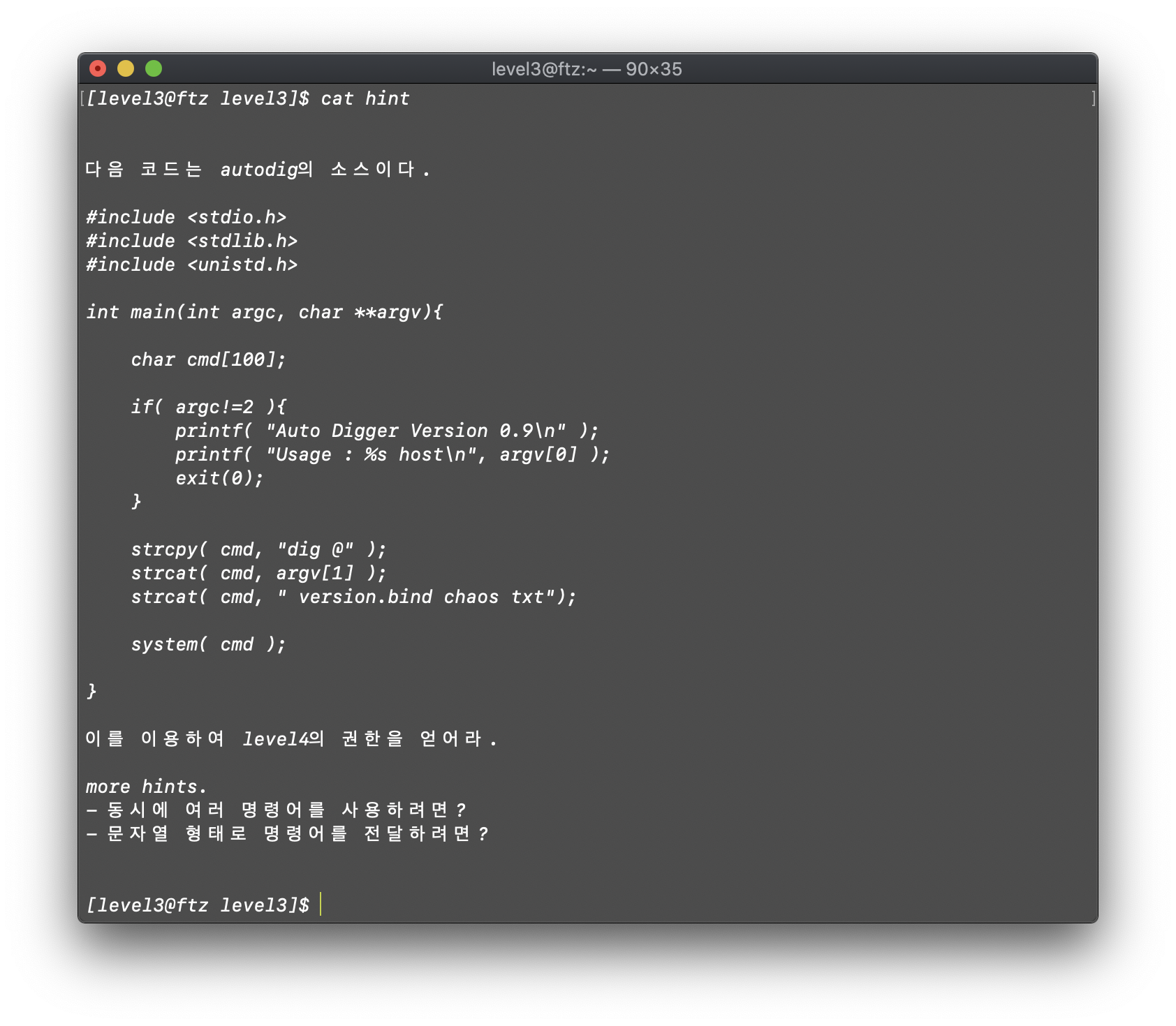 여기서 autodig를 실행할 때 문자열 형태로 인자를 전달하여 주고 만약 autodig에 SetUID가 설정되어있다면 전달받은 문자열 형태의 인자가, 즉 명령어가 root의 권한으로 실행된다.