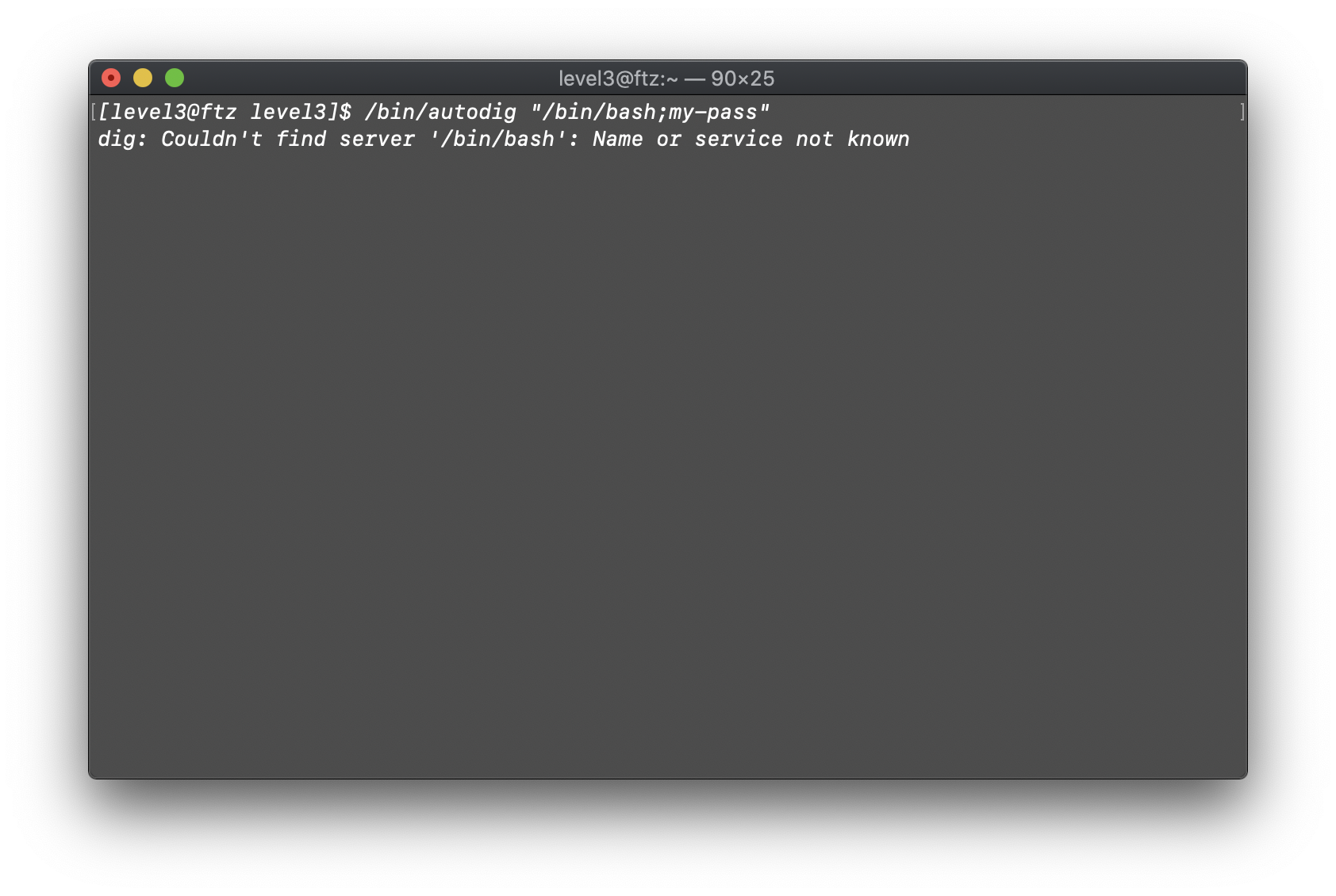 먼저 dig 명령어가 실행되고 @뒤에 ip가 아닌 문자열을 전달해주었으므로 dig에 대한 오류 메시지가 뜨고 몇초후에 level4의 passcode가 출력되는 것을 볼 수 있다.