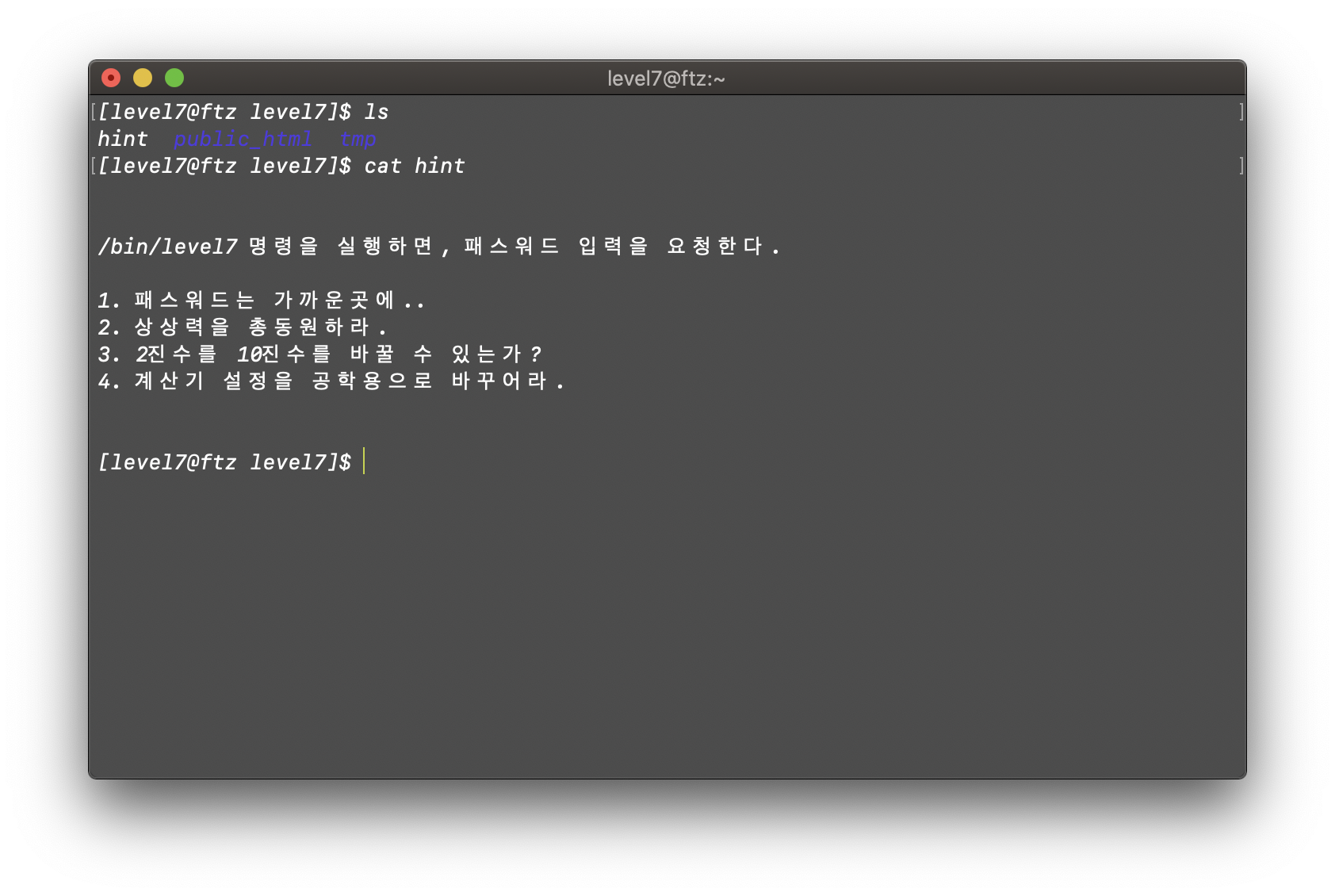 각각의 디렉토리를 뒤지기 전에 먼저 /bin/level7 프로그램을 실행하여보자.