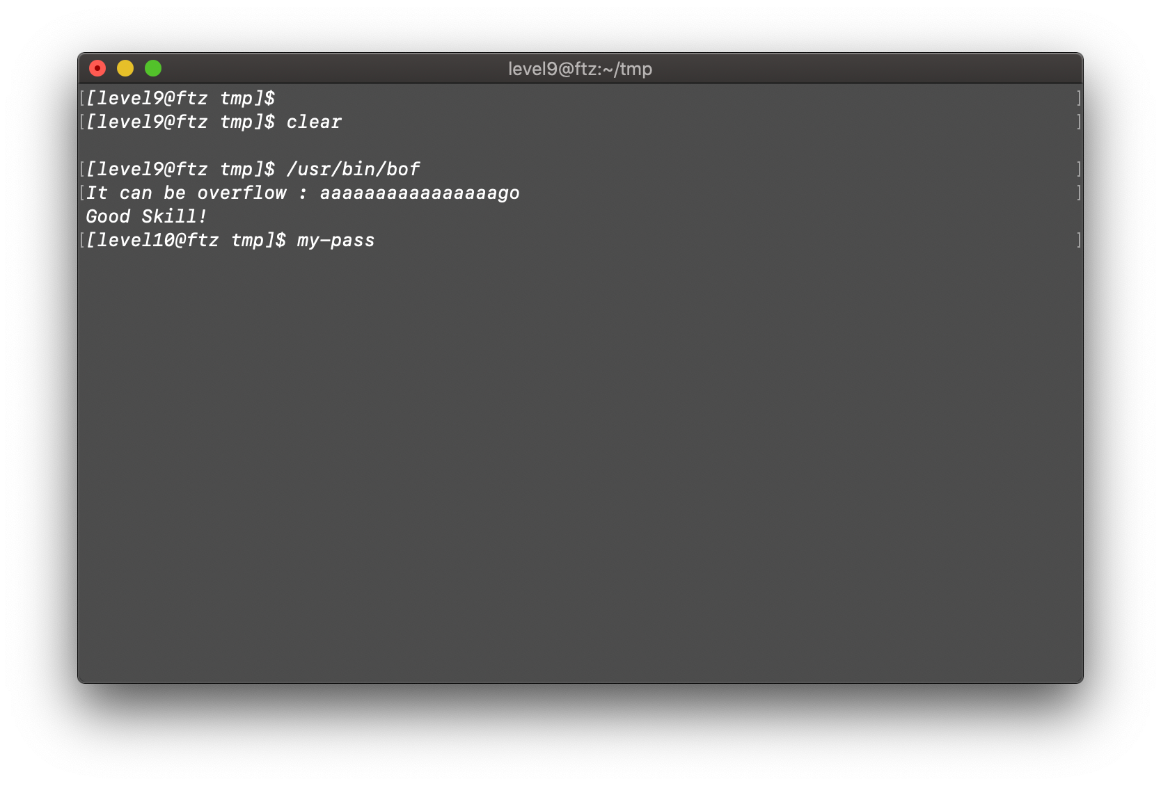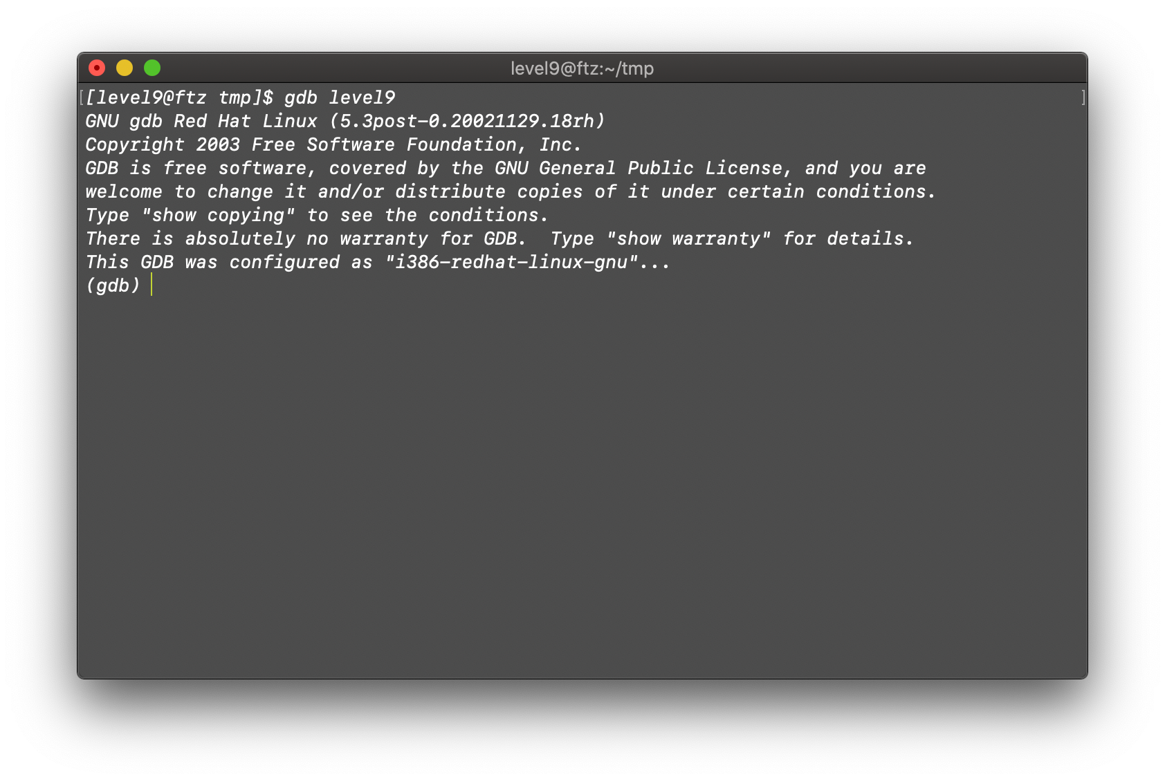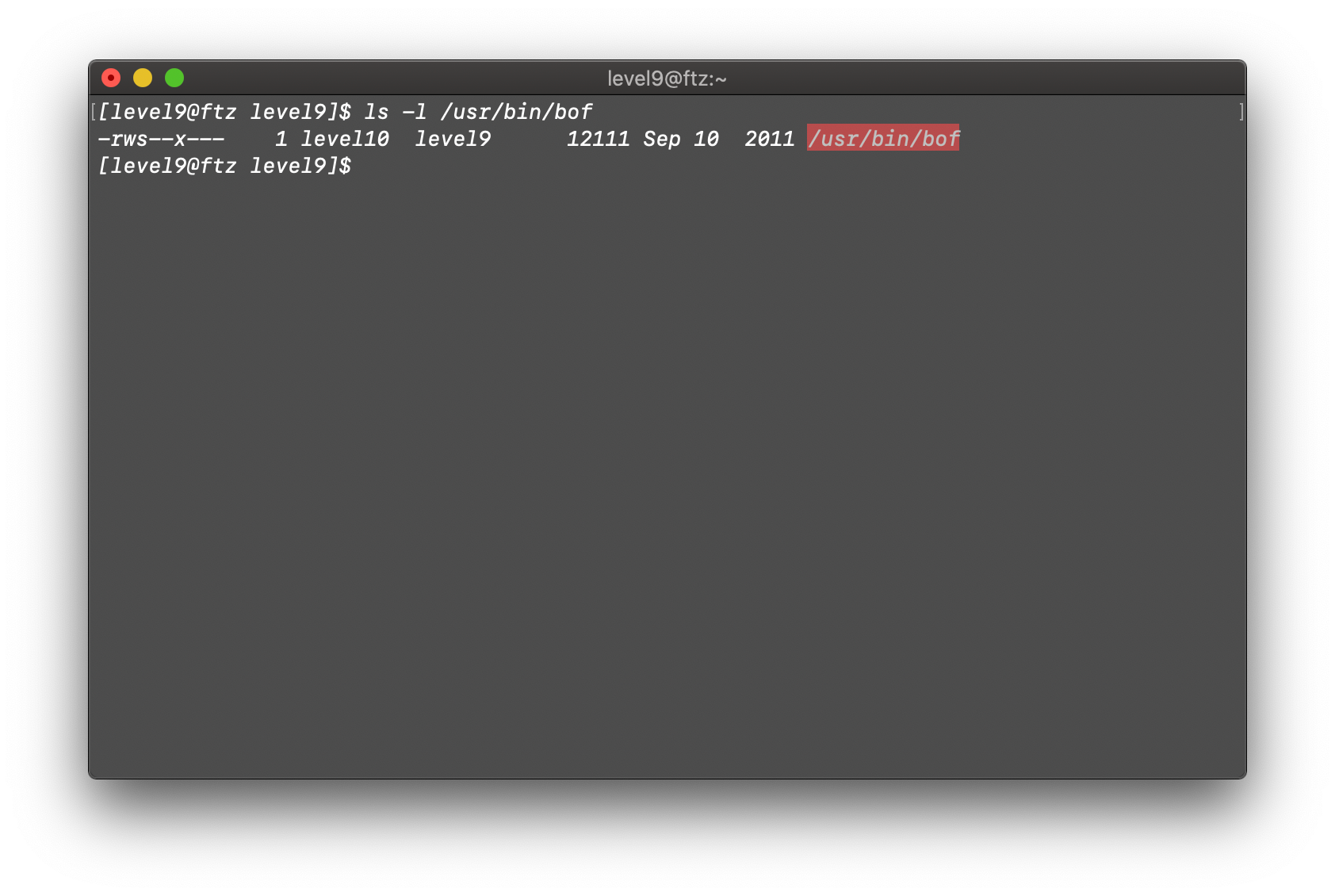 이제 level9의 권한에서도 /usr/bin/bof 프로그램과 똑같은 기능을 하는 프로그램을 만들었다. 이제 이를 이용하여 gdb를 사용해 보자.
