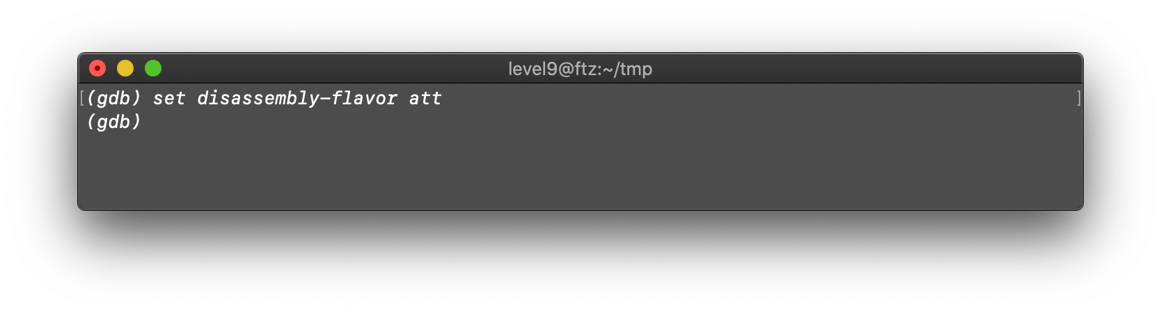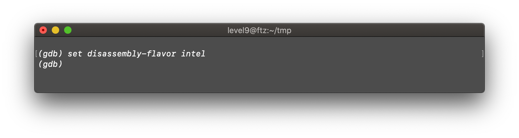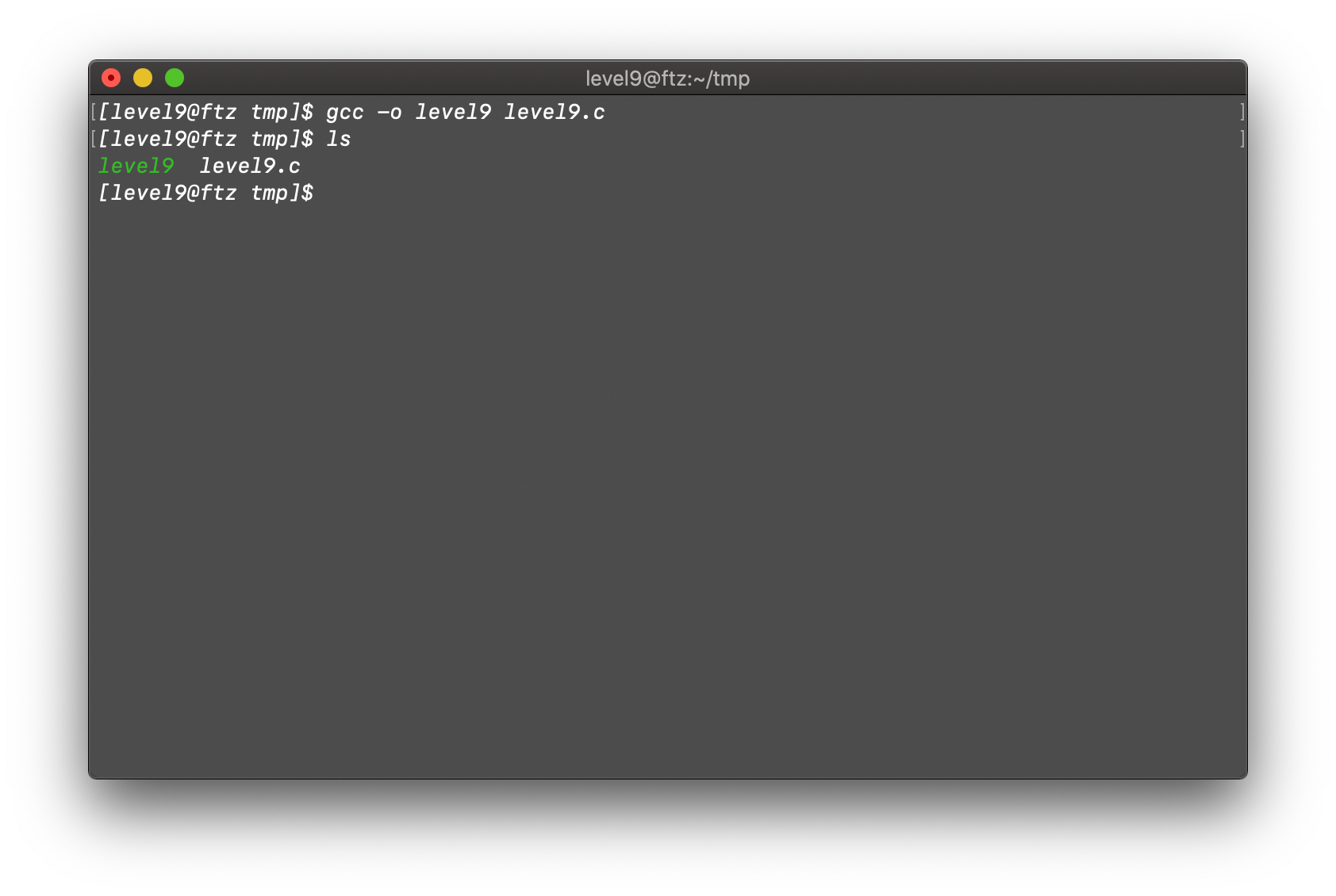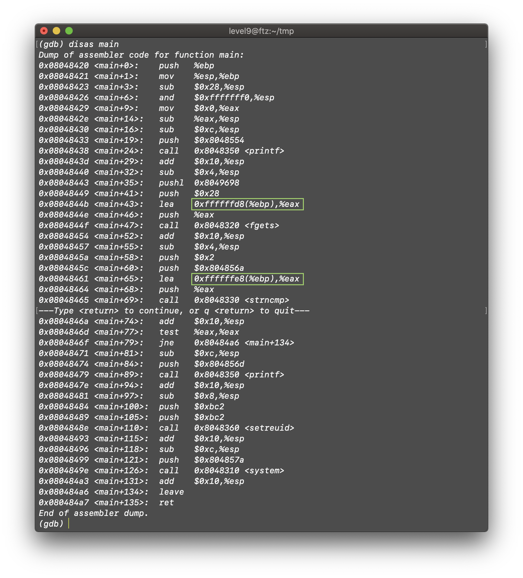 이제 level9의 권한에서도 /usr/bin/bof 프로그램과 똑같은 기능을 하는 프로그램을 만들었다. 이제 이를 이용하여 gdb를 사용해 보자.