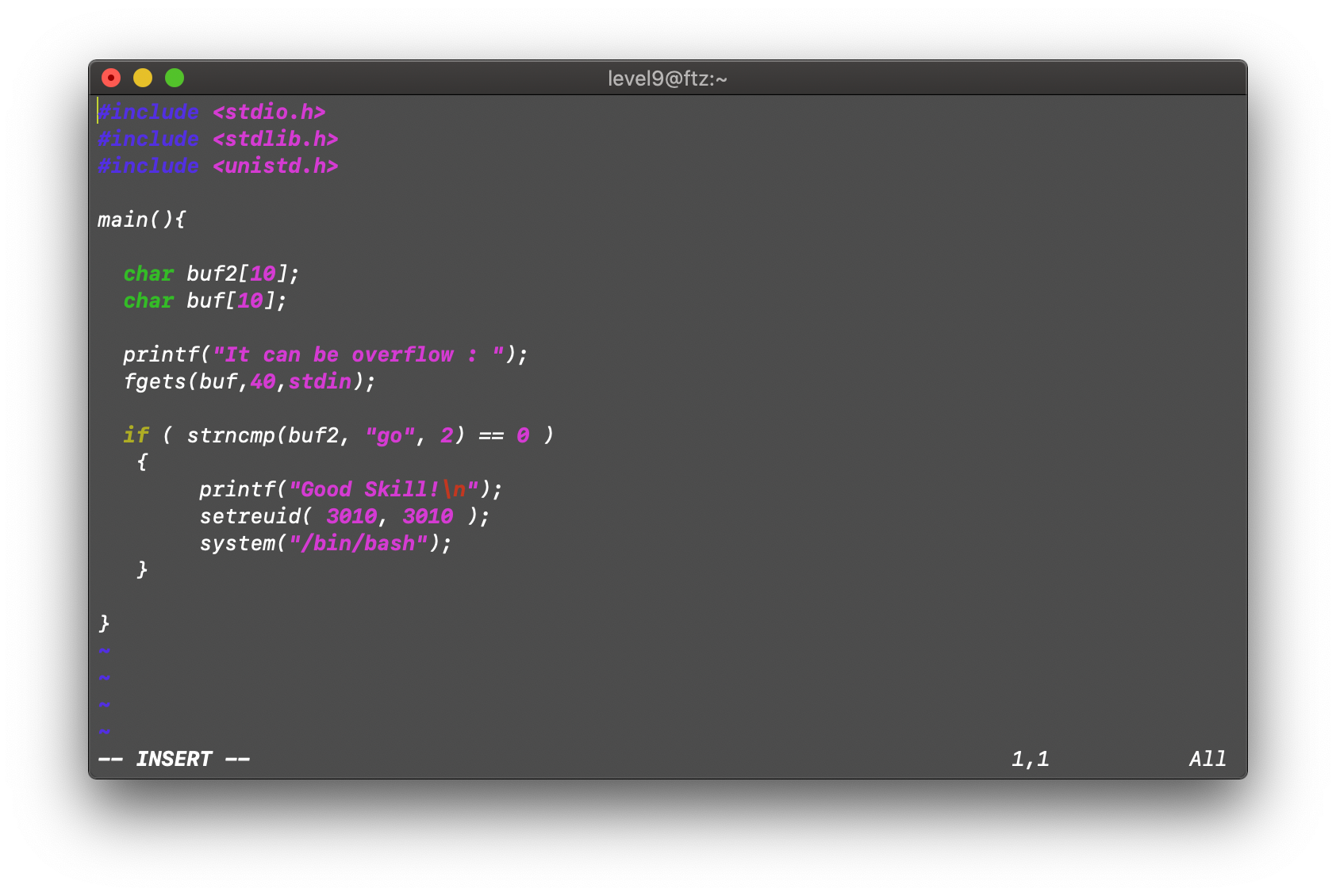우선 /usr/bin/bof 프로그램을 level9 권한에서는 x(실행)권한밖에 주어져 있지 않기 때문에 hint의 코드를 이용하여 level9에서도 /usr/bin/bash 프로그램에 대한 gdb를 사용할 수 있도록 해보자.