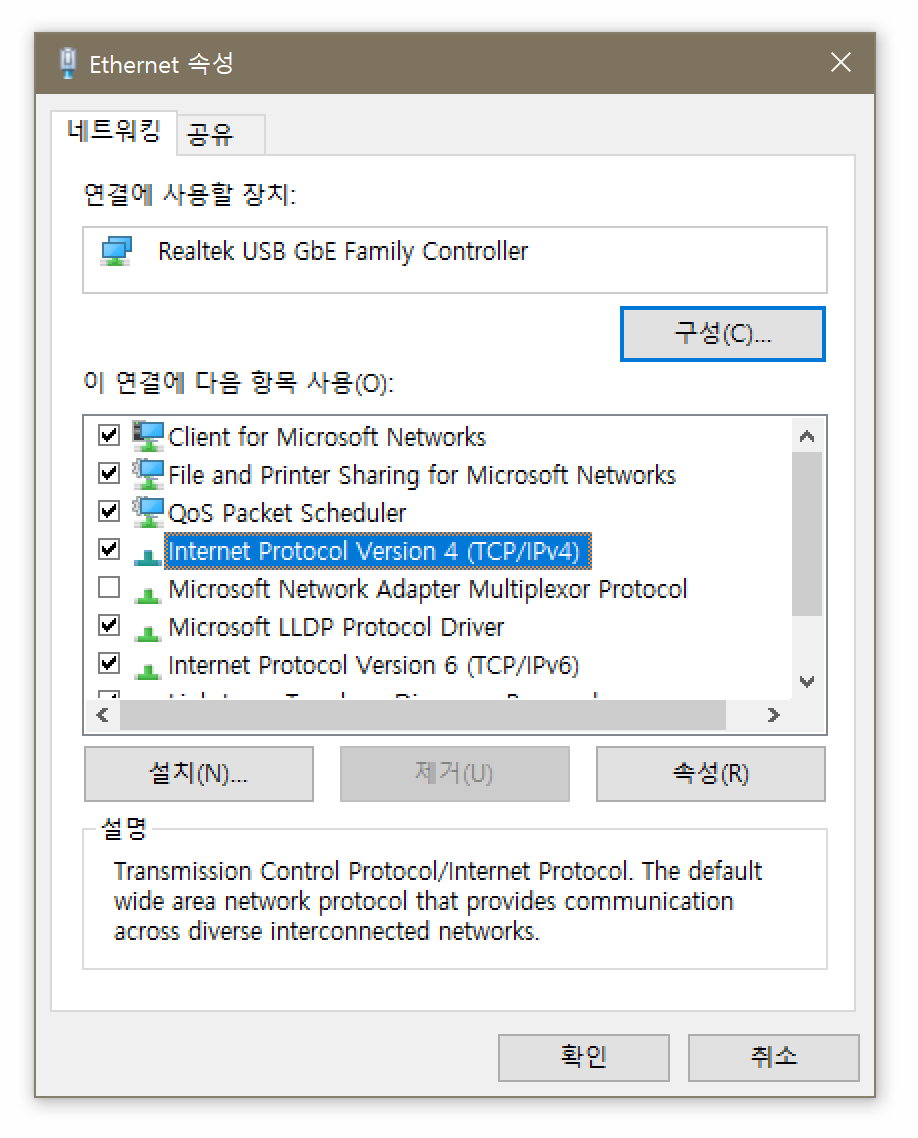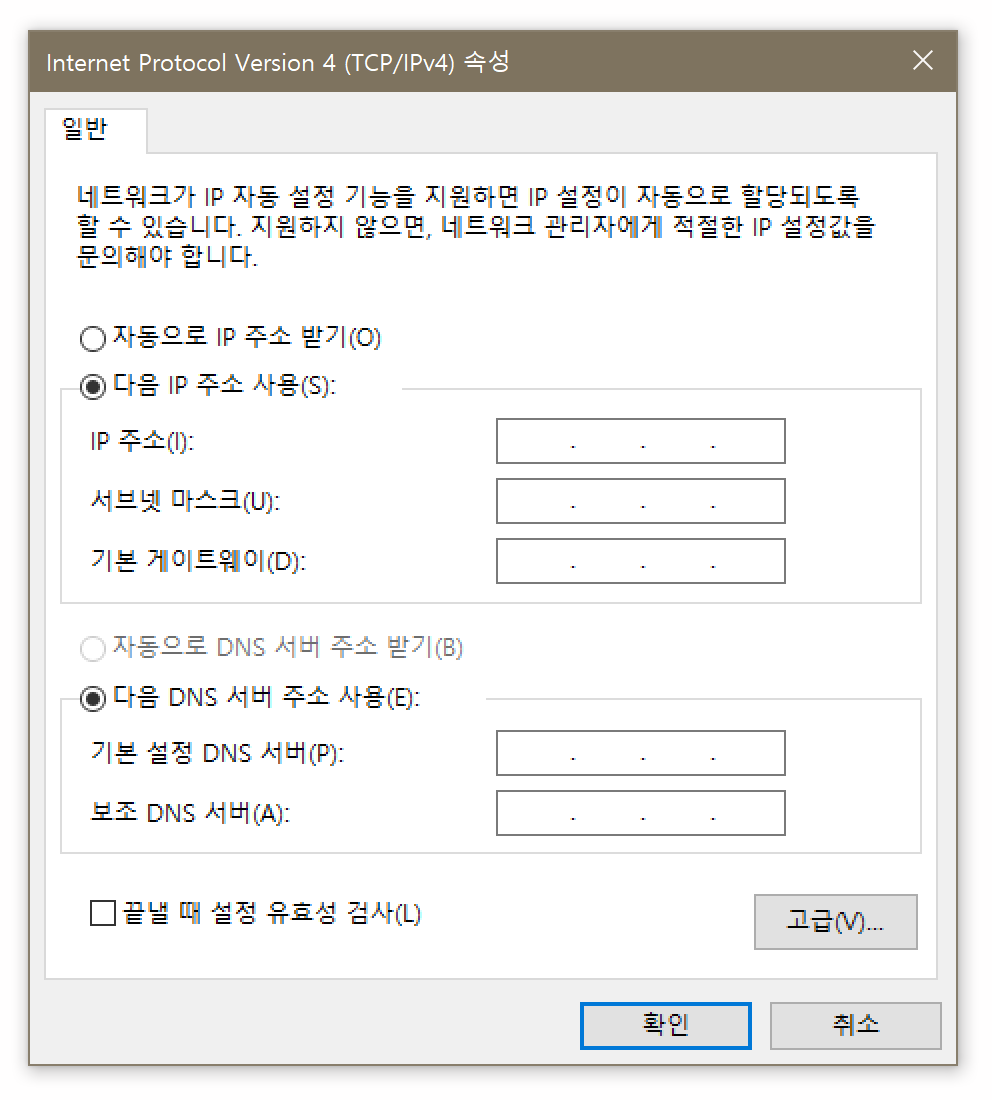 속성 - Internet Protocol Version 4 (TCP/IPv4)