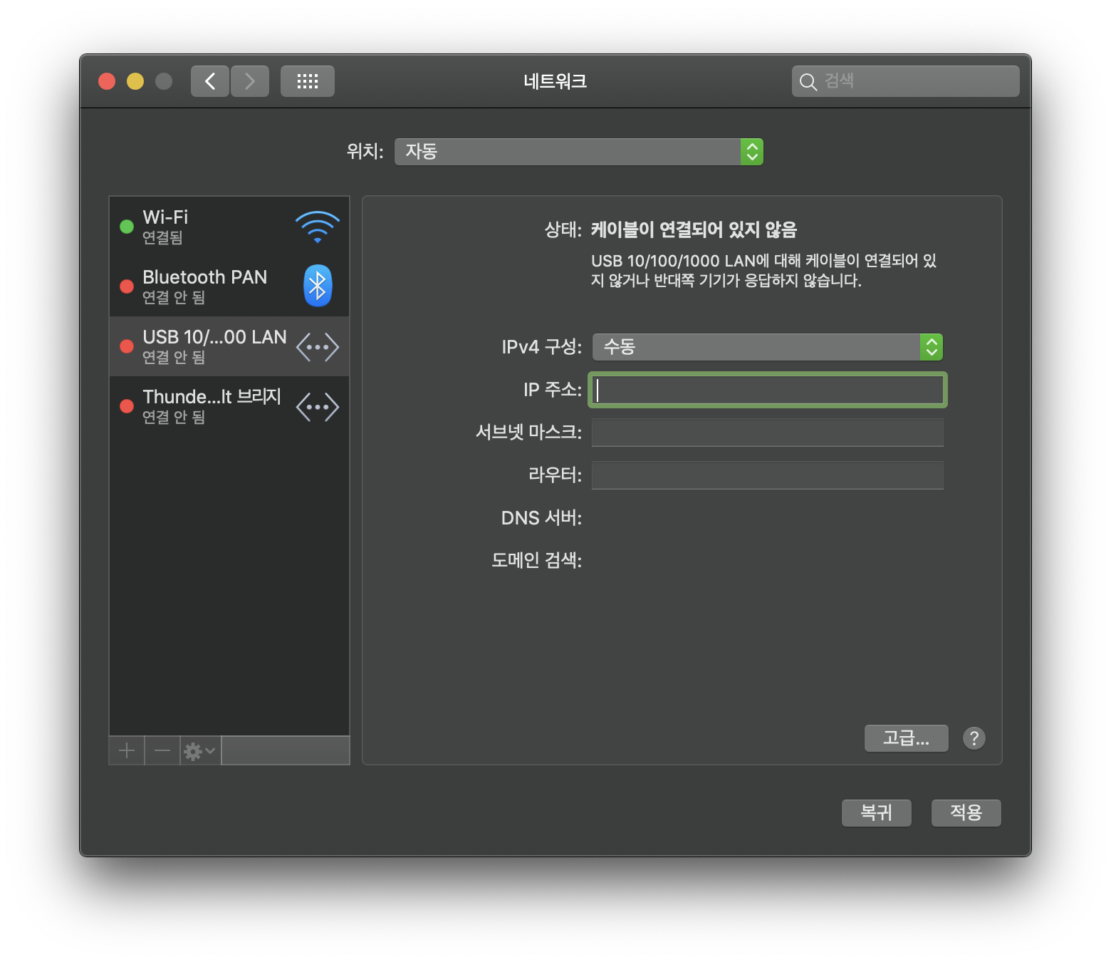 시스템 환경설정 - 네트워크 - USB 10/100/1000 LAN - IPv4 : 수동으로 설정