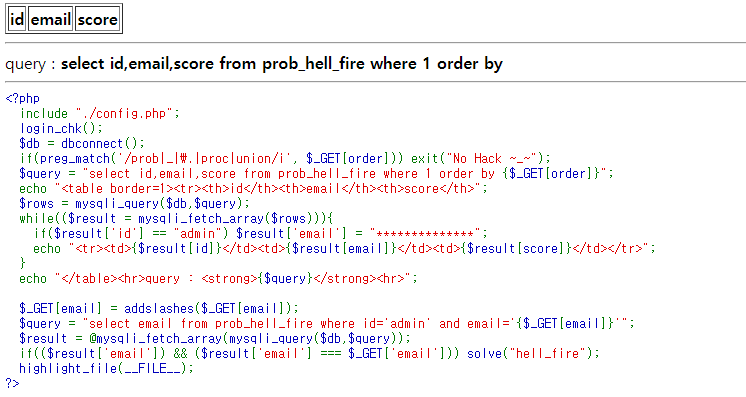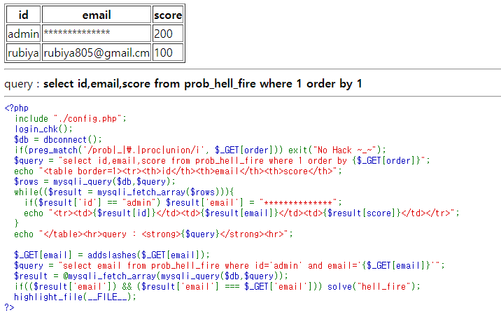 위와 같이 query 를 전달할 경우, 1번 column, 즉 id column 을 기준으로 table 이 정렬된 것을 볼 수 있다. admin 의 email 주소는 php 코드에 의하여 asterisk(*)들로 가려져 있다. 우리는 table에 접근하여 정보를 빼낼 것이기 때문에 blind injection 을 수행하면 된다.